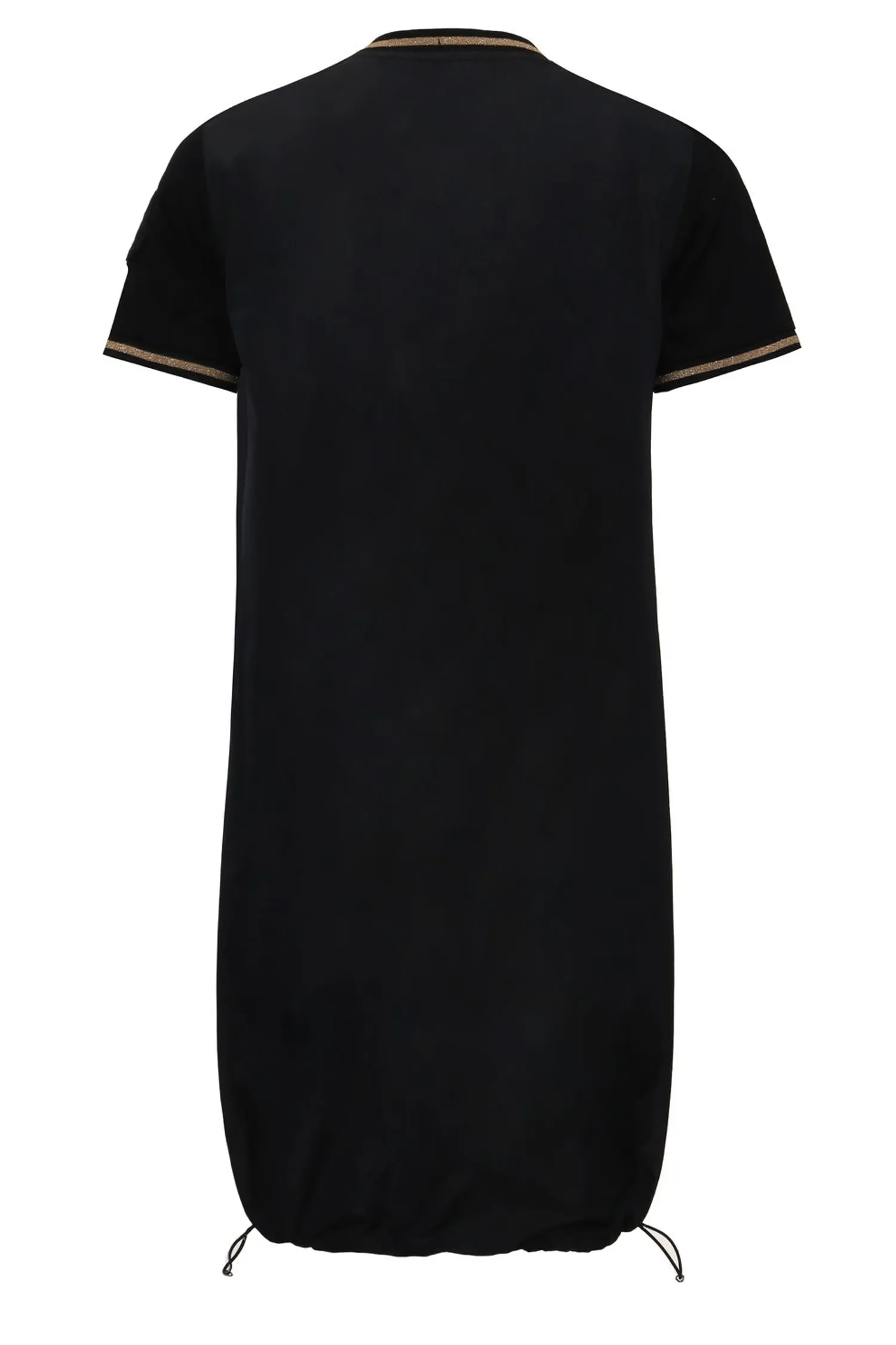 ПЛАТЬЕ-ФУТБОЛКА ЧЁРНОЕ КОМБИНИР., ТЕКСТИЛЬ+НЕЙЛОН, СНИЗУ НА КУЛИСКЕ, ЗОЛОТИСТ.ПОЛОСА НА ВОРОТЕ И РУКАВАХ