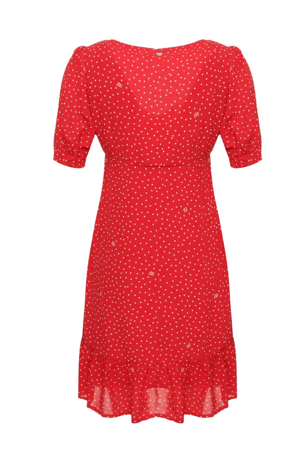 ПЛАТЬЕ КРАСНОЕ В МЕЛКИЙ МОЛОЧНЫЙ ГОРОШЕК, СВОБОДНОЕ, КОРОТКОЕ, НА ГРУДИ БАНТ, К/РУК.