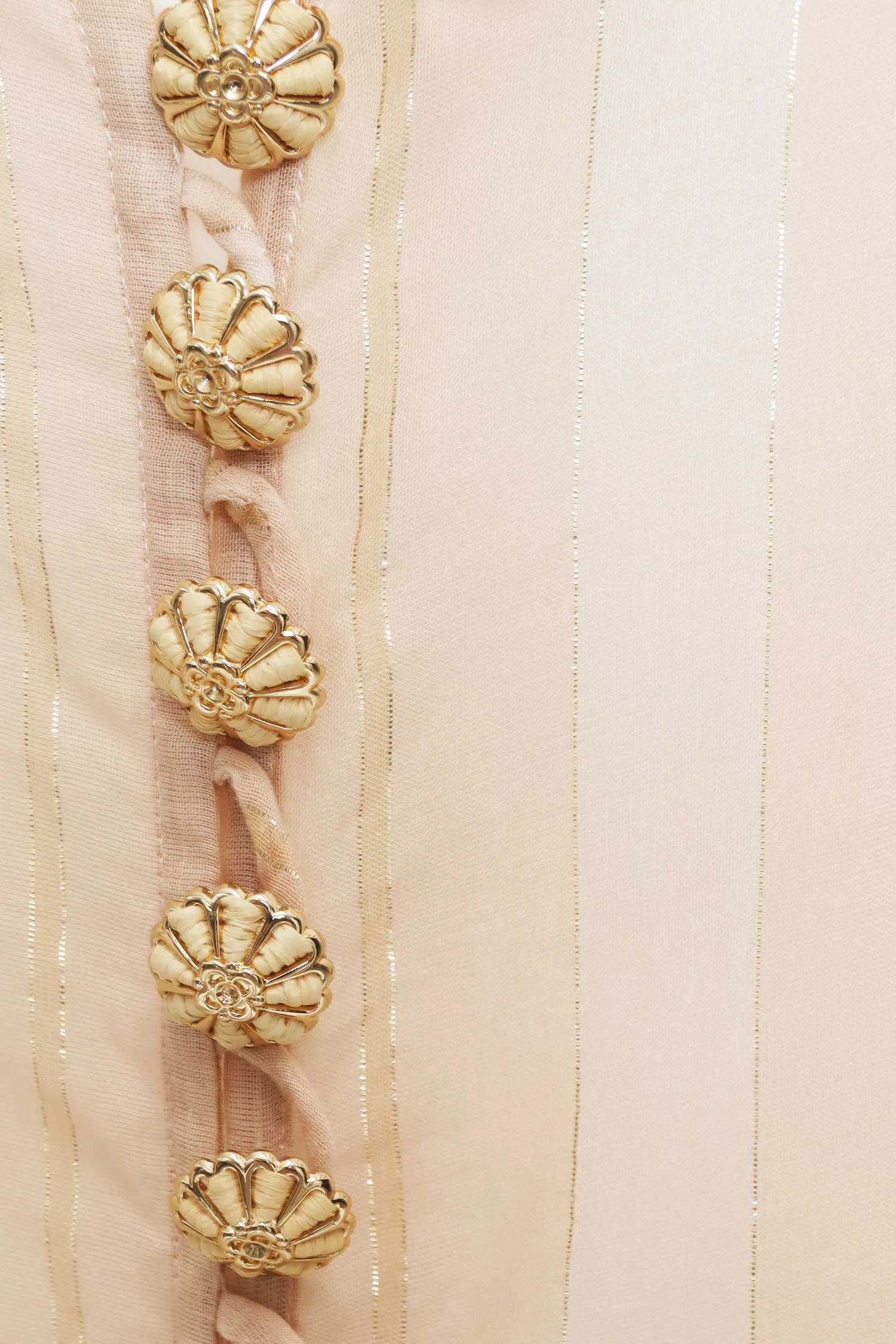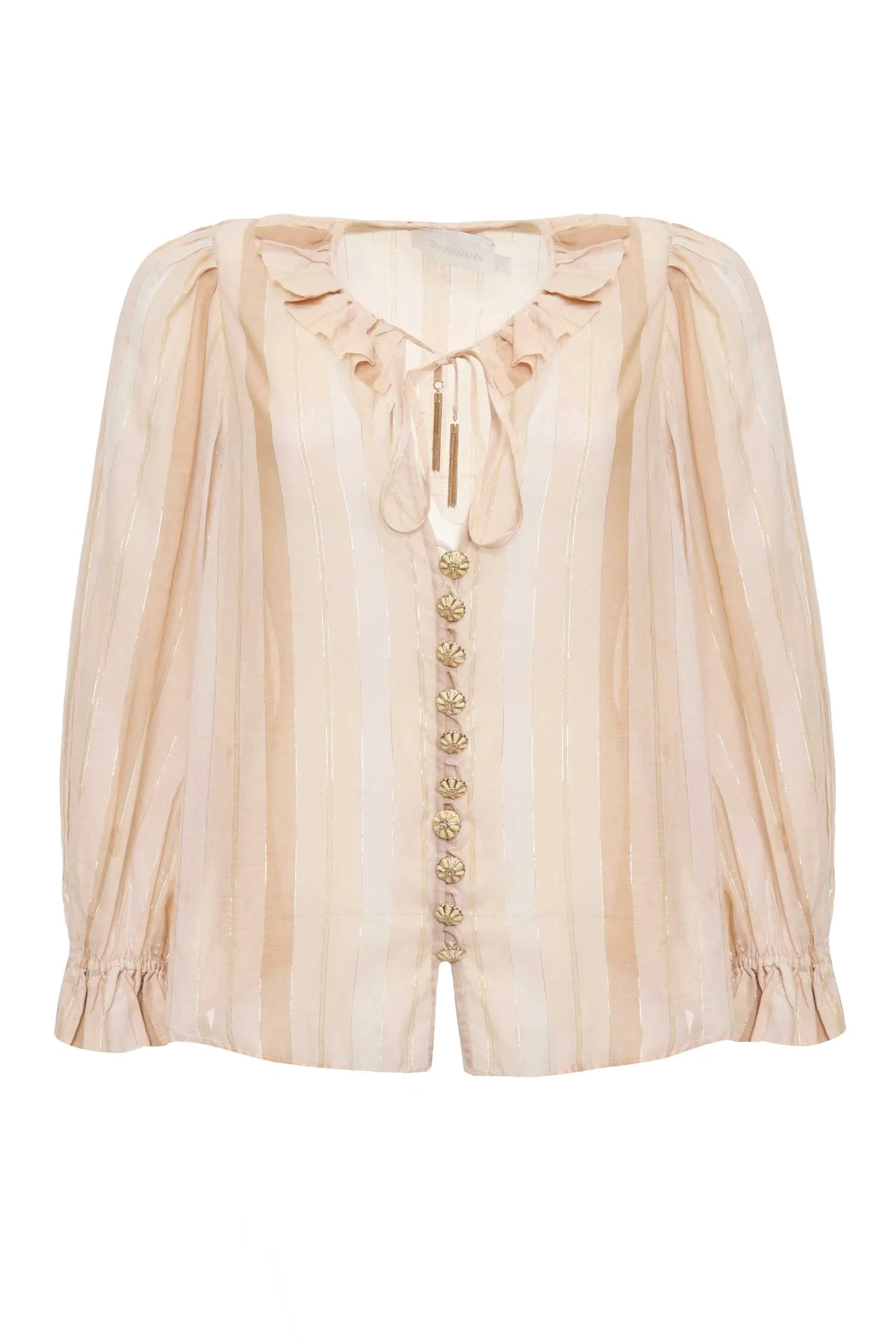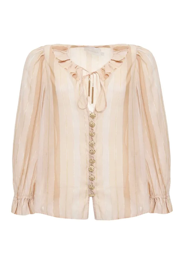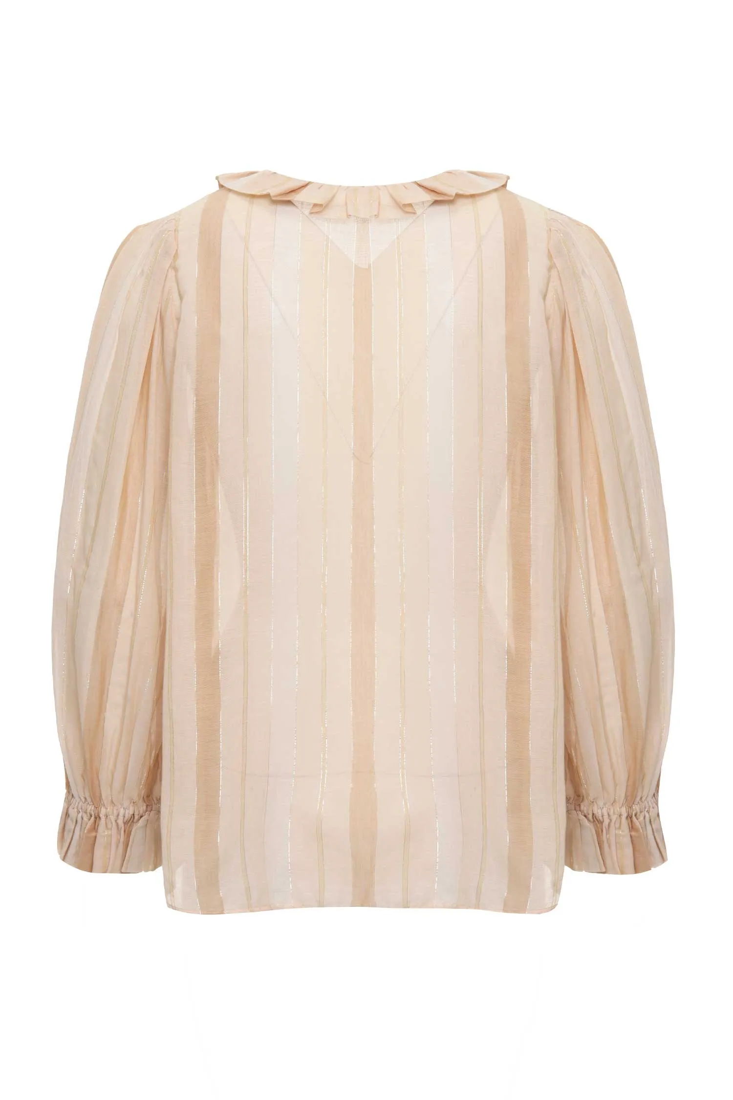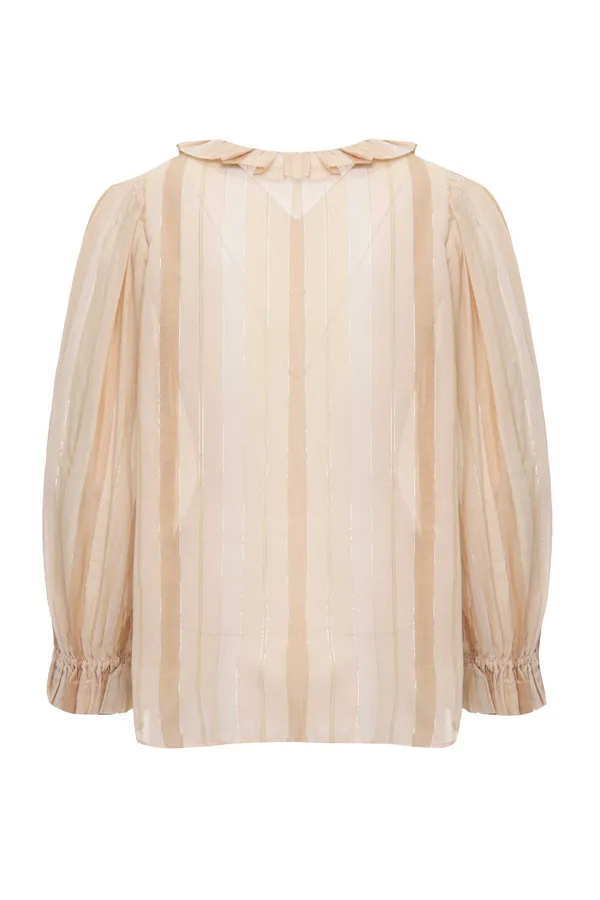 БЛУЗА СВ/БЕЖЕВАЯ С ЛЮРЕКСОМ, ВОРОТ НА ЗАВЯЗКАХ, ОТД.РЮШИ