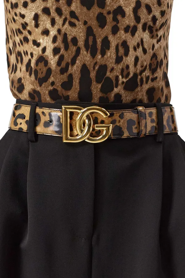 РЕМЕНЬ КОРИЧНЕВО-ЧЁРНЫЙ ЛАК, ПРИНТ ЛЕОПАРД, ЗОЛОТИСТАЯ ПРЯЖКА-ЛОГО, Ш=4