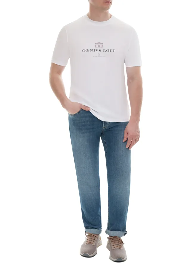 Джинсы Brunello Cucinelli из плотного хлопкового денима с добавлением эластана — универсальная модель на каждый день. Ткань сохраняет характерную структуру денима, при этом остаётся комфортной в движении. Крой с пятью карманами и аккуратной линией по ноге формирует собранный силуэт без излишней жёсткости. Подходят для города и легко сочетаются с трикотажем, рубашками и жакетами.