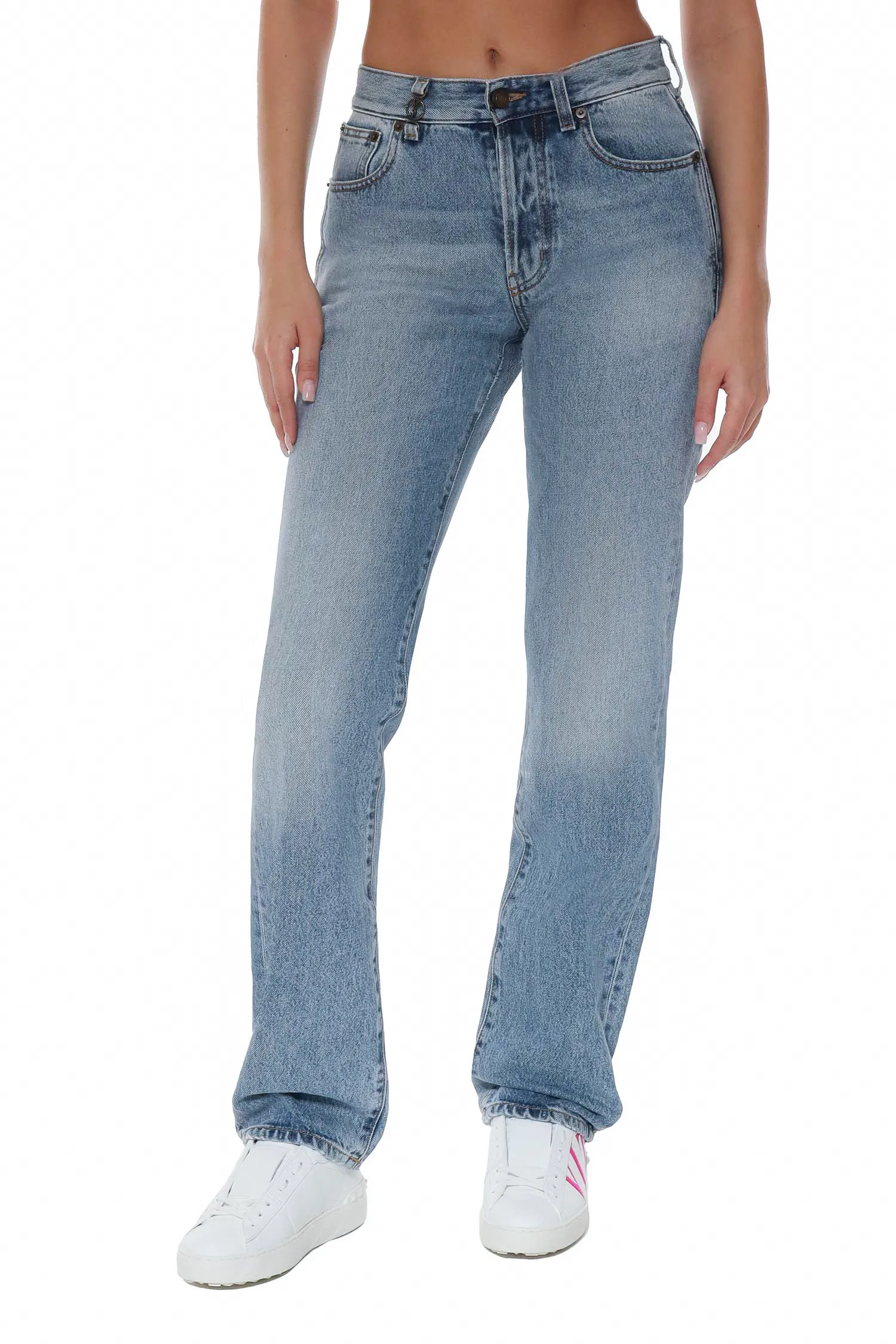 SAINT LAURENT ДЖИНСЫ CASSANDRE ГОЛУБЫЕ ВЫБЕЛЕННЫЕ, СЗАДИ ПОТЁРТОСТИ, МЕТАЛЛ.ЛОГО НА ШЛЁВКЕ, Ш=19
