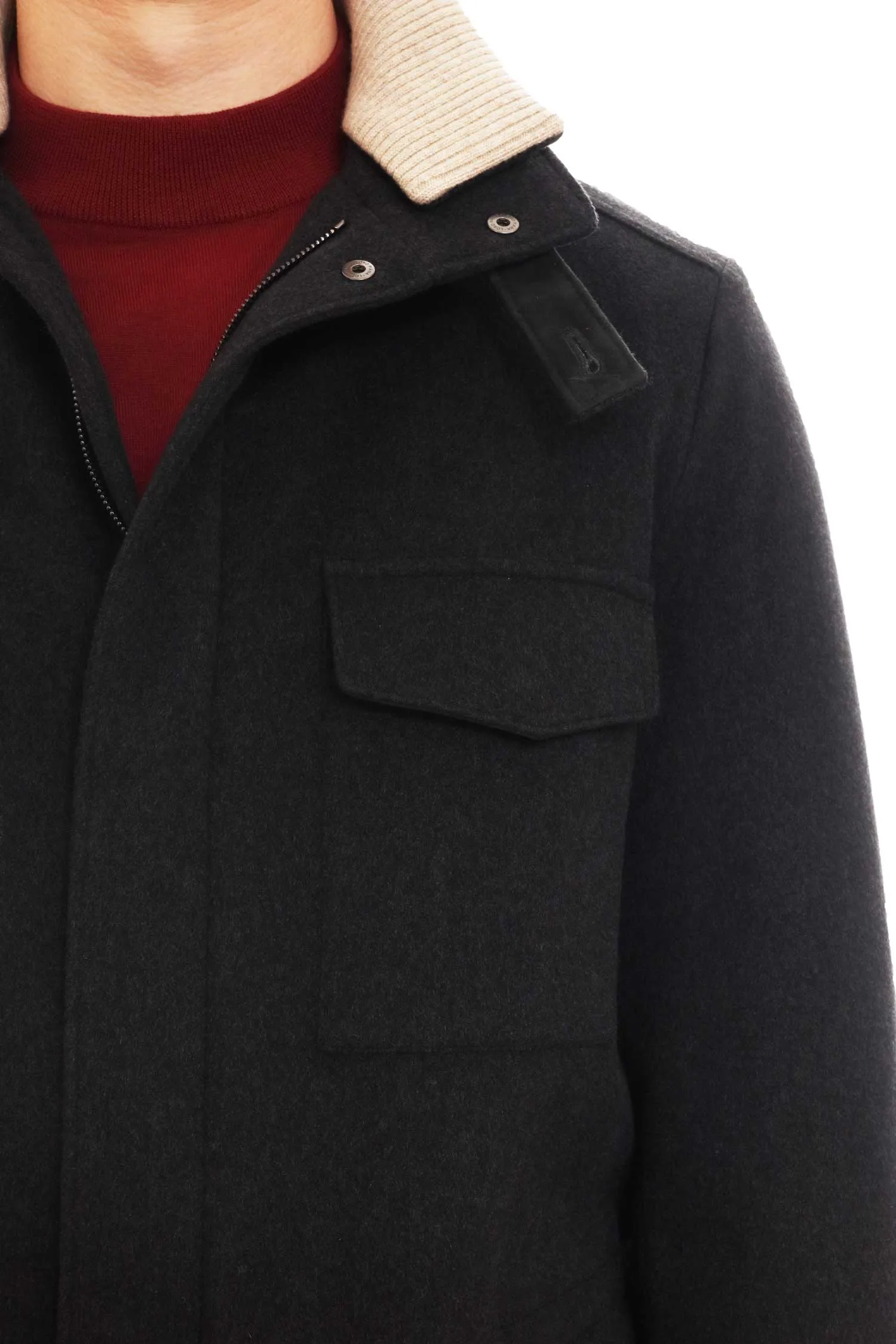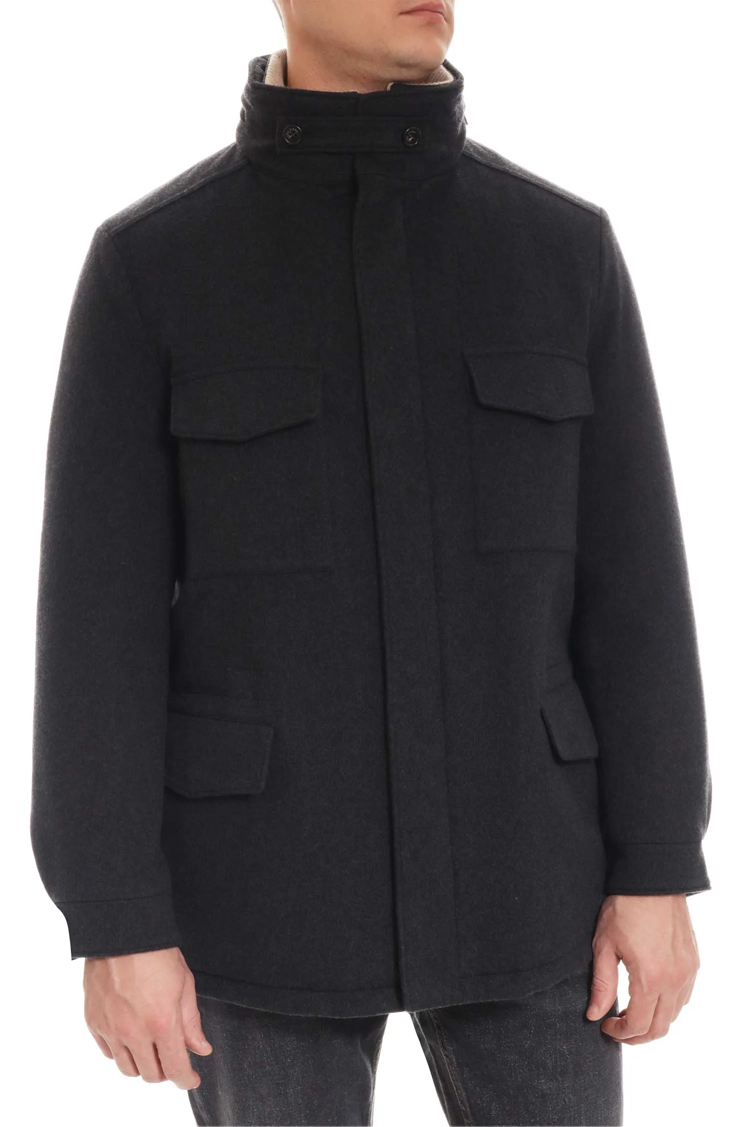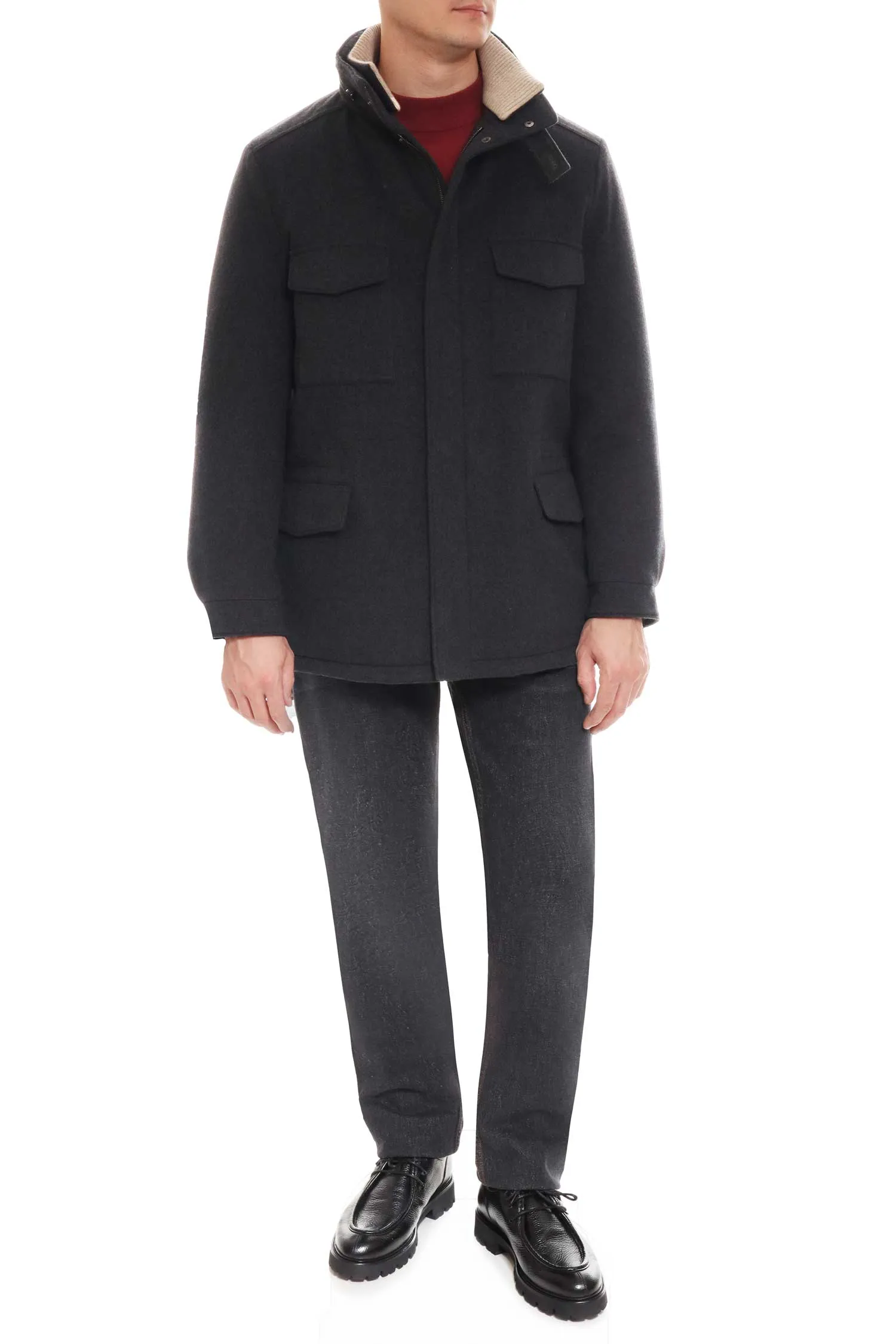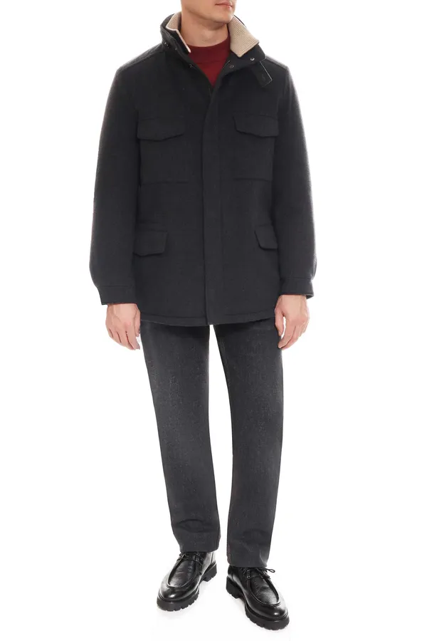 Куртка-пальто Loro Piana из тёмно-серого кашемира сочетает в себе комфорт и сдержанную элегантность. Прямой силуэт можно подкорректировать с помощью скрытой кулиски на талии, а воротник-стойка с хлястиком добавляет выразительности. Четыре функциональных кармана подчёркивают практичный характер вещи. Безупречный выбор для города в холодный сезон.
