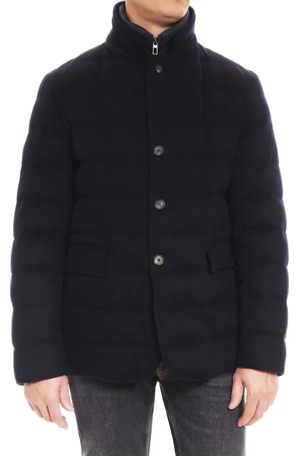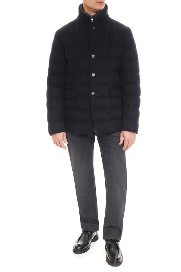 Тёмно-синяя куртка-пуховик Loro Piana — удачный баланс между утончённым стилем и практичностью. Выполненная из кашемира с водоотталкивающей пропиткой Storm System®, она защищает от ветра и осадков. Внутренняя нейлоновая подстёжка с воротником-стойкой и молнией создаёт эффект двухслойности и добавляет тепла. Прямой силуэт, нагрудный и боковые карманы, замшевые детали. Совершенная вещь для городской зимы.