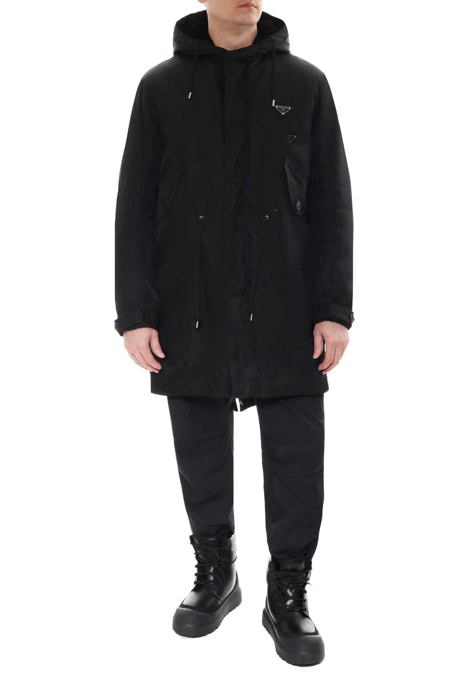 Мужская парка Prada из инновационного переработанного нейлона Re-Nylon сочетает в себе функциональность и фирменный стиль бренда. Модель дополнена капюшоном, клапанами на карманах, кулиской на талии и съёмной тёплой подстёжкой из овчины. Эмалированный металлический треугольник с логотипом придаёт образу узнаваемый акцент.