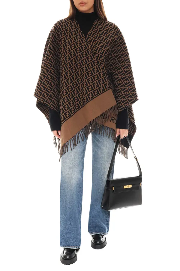 ПОНЧО КОРИЧНЕВОЕ В МЕЛКОЕ ЧЁРНОЕ ЛОГО, КАШЕМИР, БАХРОМА