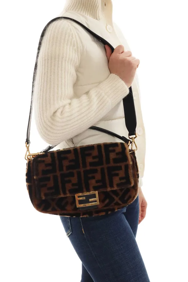 Fendi Baguette Medium — знаковая модель в исполнении из мягкой овчины с графичным логотипом FF в черном цвете и золотистой пряжкой. Внутри — одно отделение и карман на молнии. Передний клапан на магнитной застёжке. Модель дополняют плоская кожаная ручка и съёмный ремень, позволяющие носить сумку в руке, на плече или кросс-боди. Сделано в Италии.