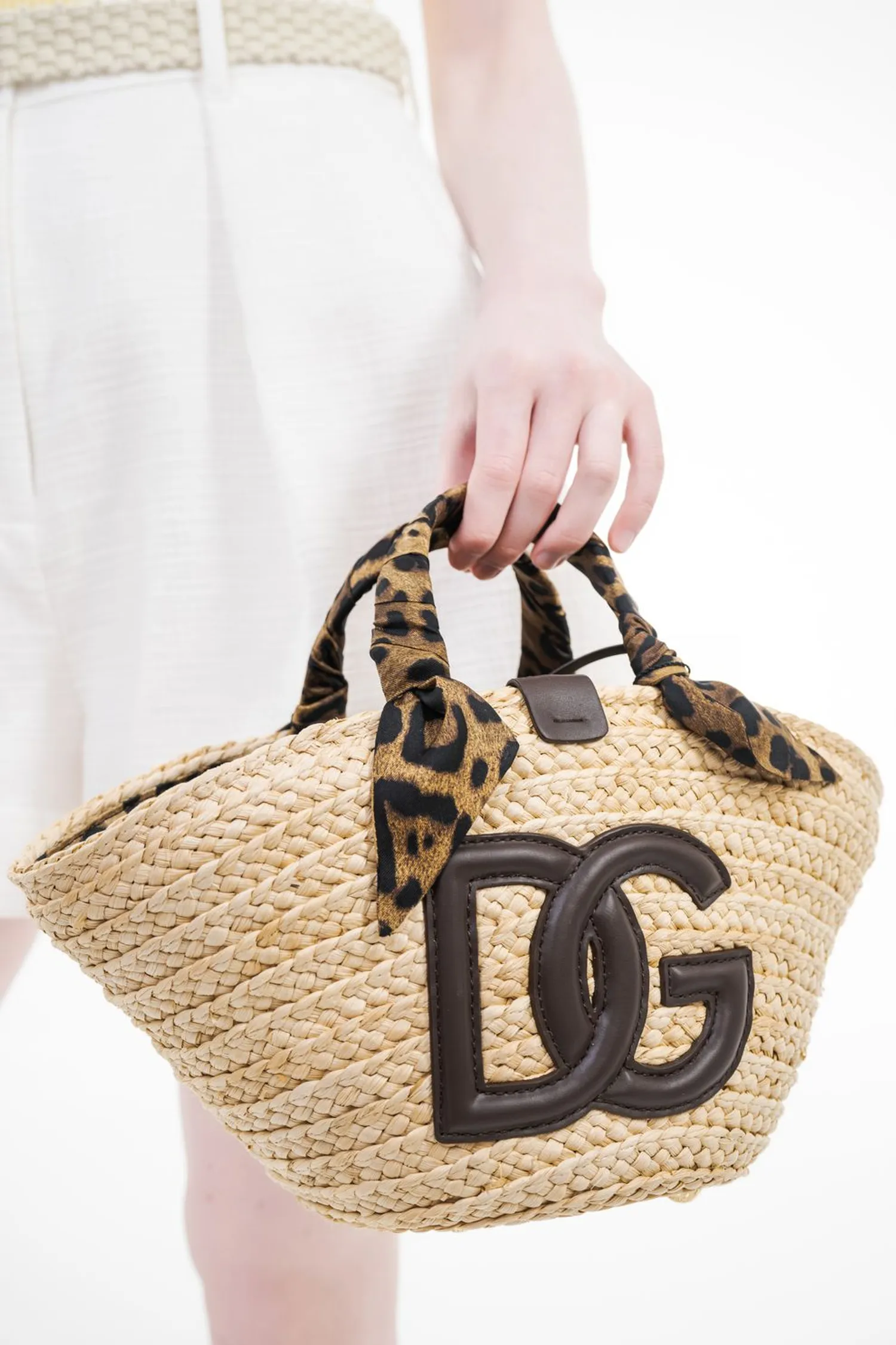 СУМКА-ШОПЕР KENDRA МАЛЕНЬКАЯ БЕЖЕВАЯ ПЛЕТЁНАЯ, РУЧКА С ПЛАТКОМ, ПРИНТ ЛЕОПАРД, КОРИЧНЕВЫЕ ЛОГО-БУКВЫ