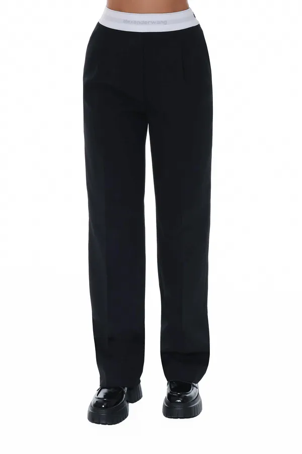 БРЮКИ ЧЁРНЫЕ ШЕРСТЬ, С ЗАЩИПАМИ, БЕЛАЯ РЕЗИНКА С ЛОГО-НАДПИСЬЮ