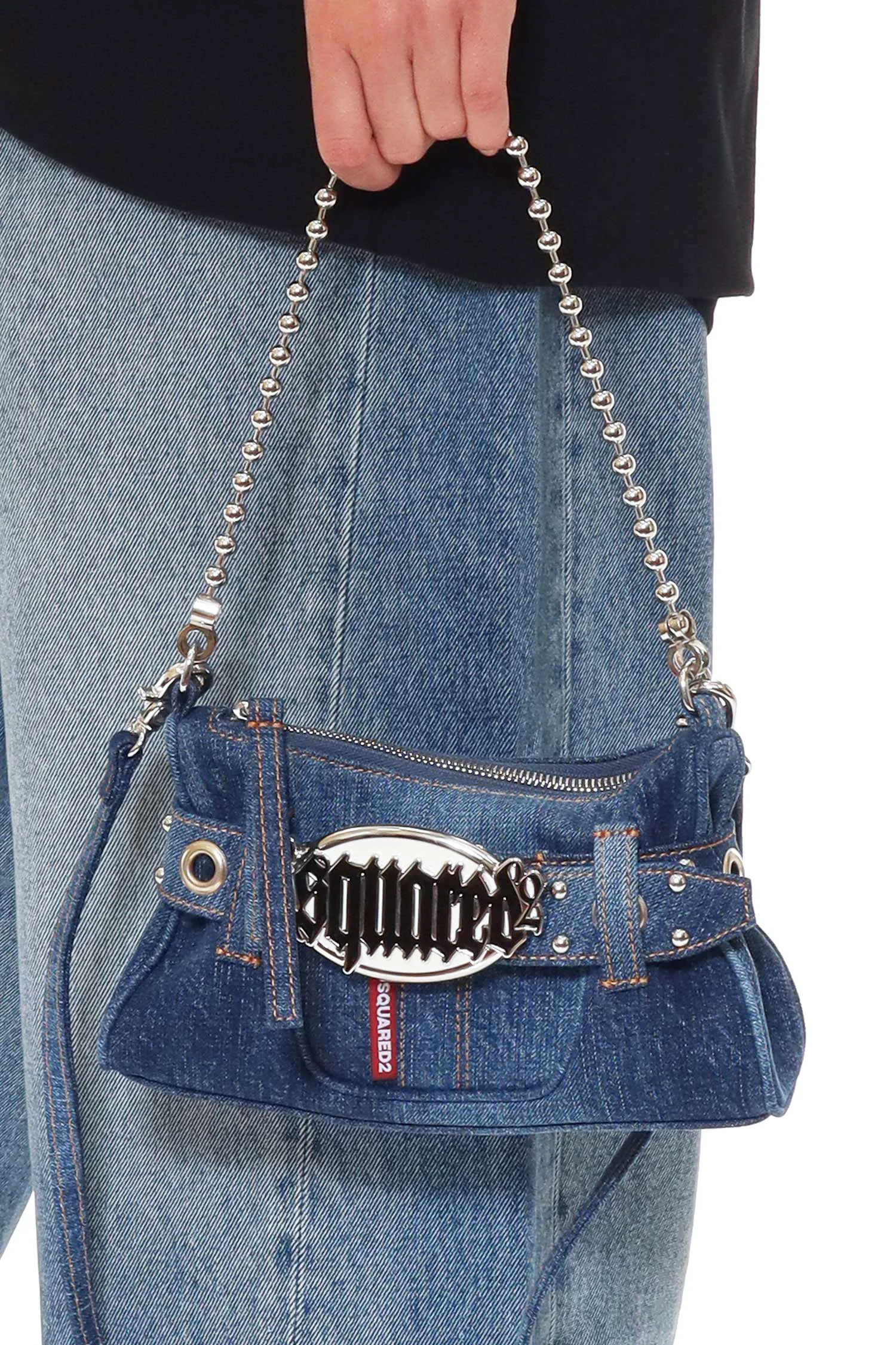 СУМКА СИНЯЯ ДЖИНСОВАЯ, МАЛЕНЬКАЯ, РЕМЕШОК С МЕТАЛЛ. ЛОГО-ПРЯЖКОЙ, НАКЛАДНОЙ КАРМАН, ЦЕПОЧКА
