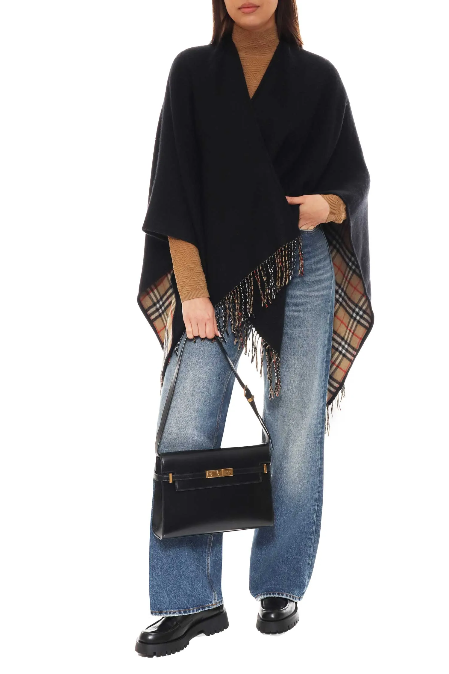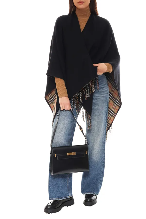 ПОНЧО ЧЁРНОЕ ШЕРСТЬ, ВНУТРЕННЯЯ ОТДЕЛКА В КЛЕТКУ, БАХРОМА