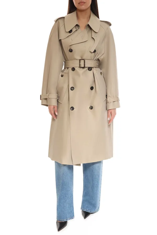 Изысканный двубортный тренч Loro Piana выполнен из лёгкого хлопка с добавлением шёлка в молочном оттенке. Классический силуэт дополнен погонами, отложным воротником и поясом, подчёркивающим талию. Благородный материал придаёт модели мягкость и утончённый блеск. Универсальный выбор для межсезонья — элегантный, но практичный.