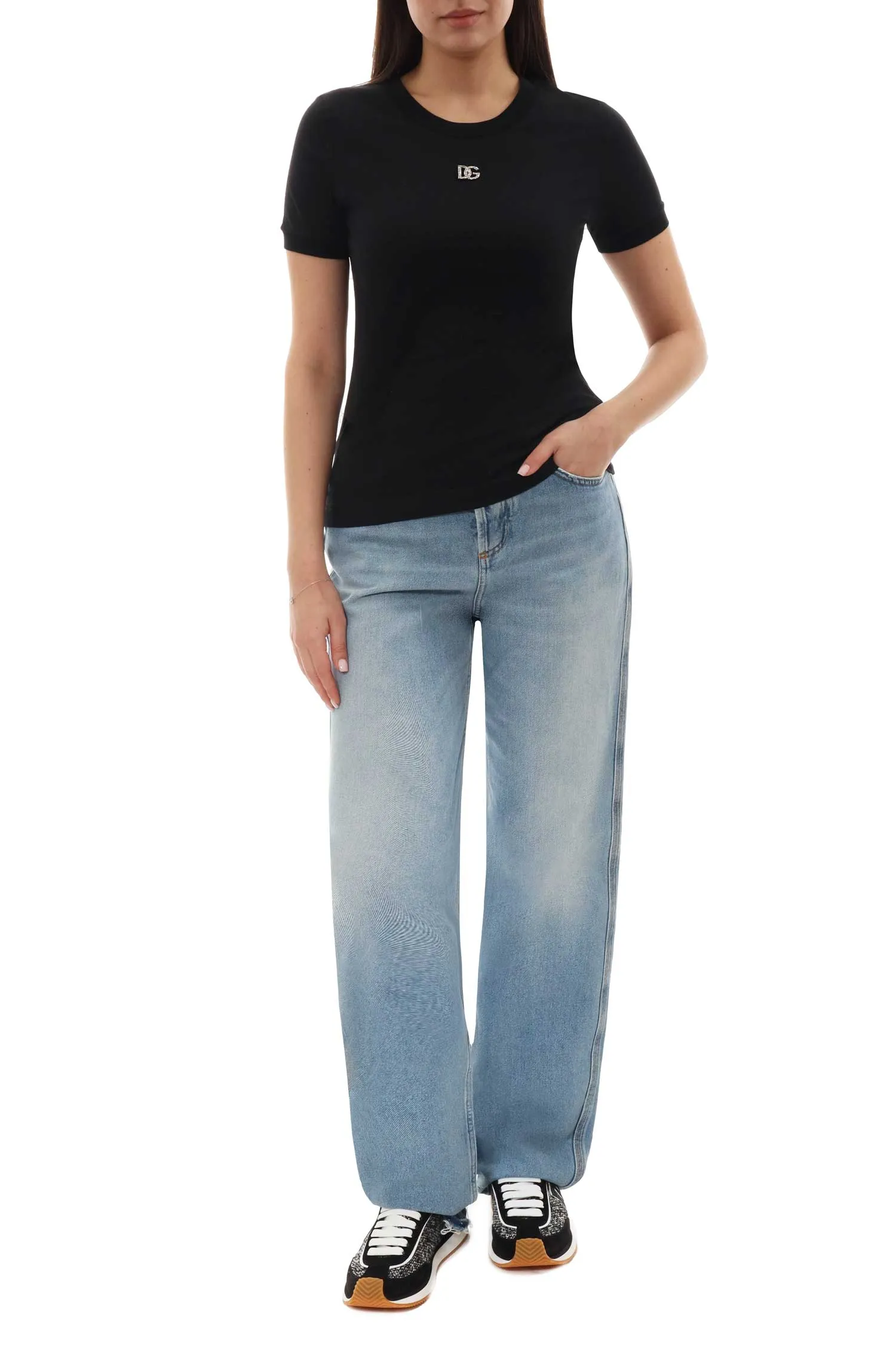 ФУТБОЛКА M.808 ЧЁРНАЯ, НА ГРУДИ МЕТАЛЛ.ЛОГО DG СО СТРАЗАМИ, МАНЖЕТЫ