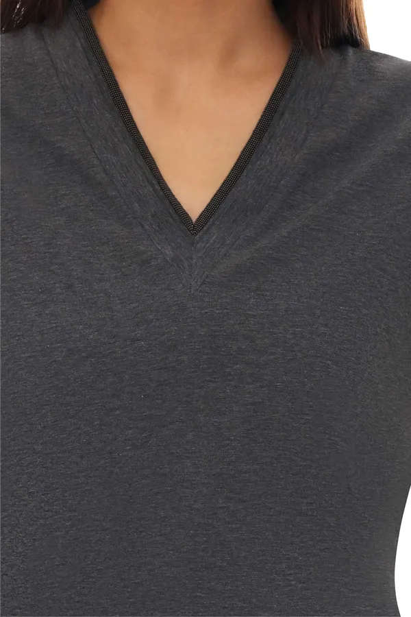 ФУТБОЛКА Т/СЕРАЯ, ВОРОТ ОТД.ЦЕПОЧКАМИ МОНИЛЬ, V-ВЫРЕЗ, РУКАВА С ОТВОРОТАМИ