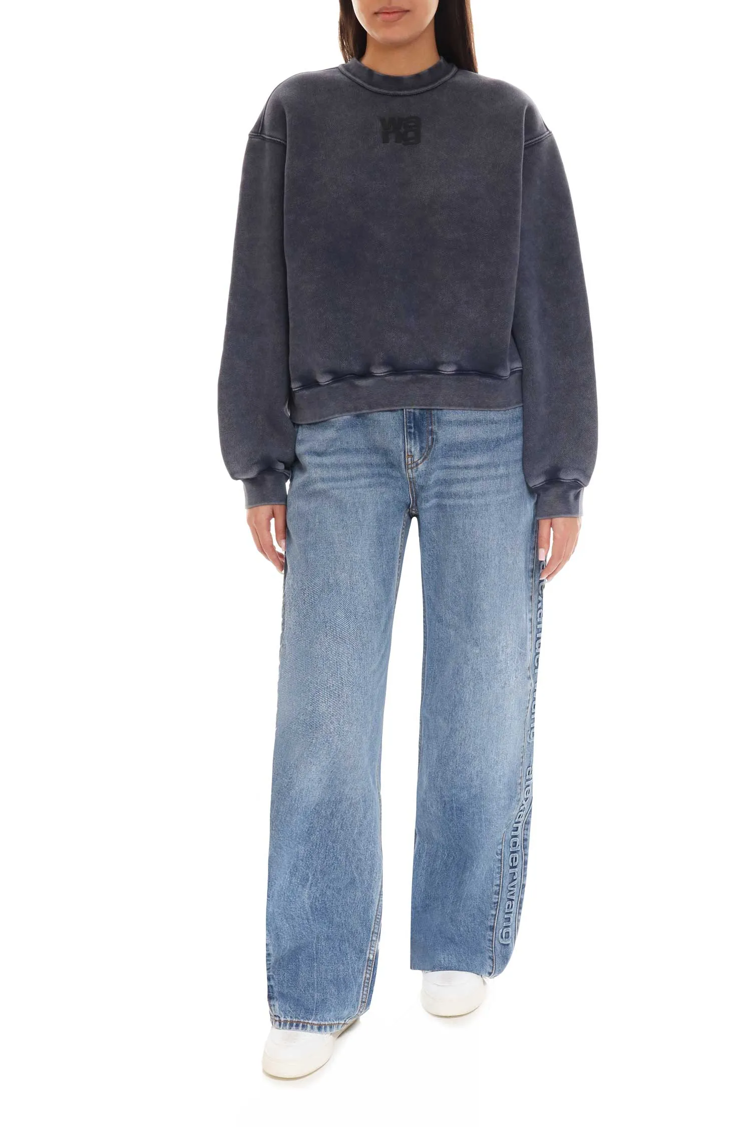 ALEXANDER WANG СВИТШОТ Т/СИНИЙ ВЫВАРЕННЫЙ, УТЕПЛЁННЫЙ, УКОРОЧЕННЫЙ, ЧЁРНОЕ ЛОГО НА ГРУДИ