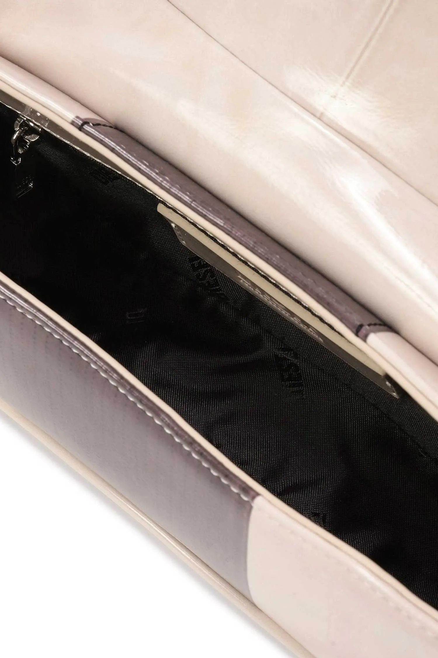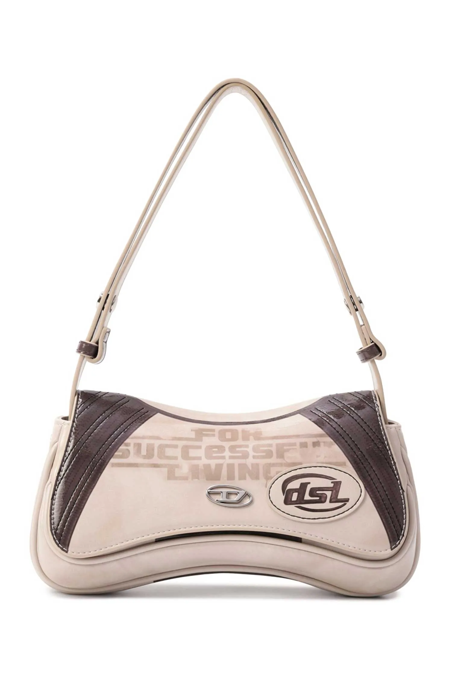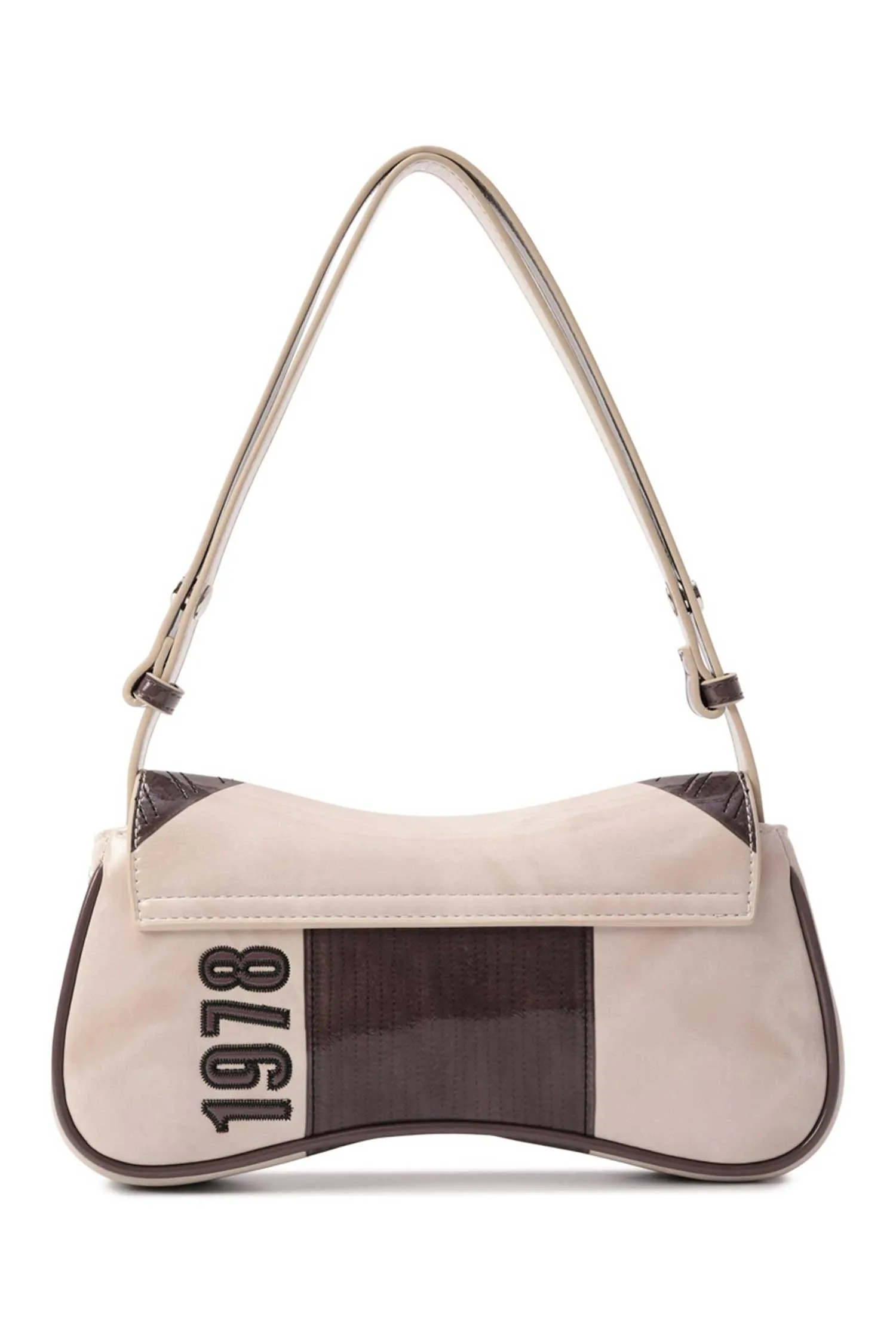 СУМКА PLAY CLUTCH Т/МОЛОЧНО-КОРИЧНЕВАЯ ЛАК, НАДПИСИ, С КЛАПАНОМ, МЕТАЛЛ.ЛОГО, РУЧКА