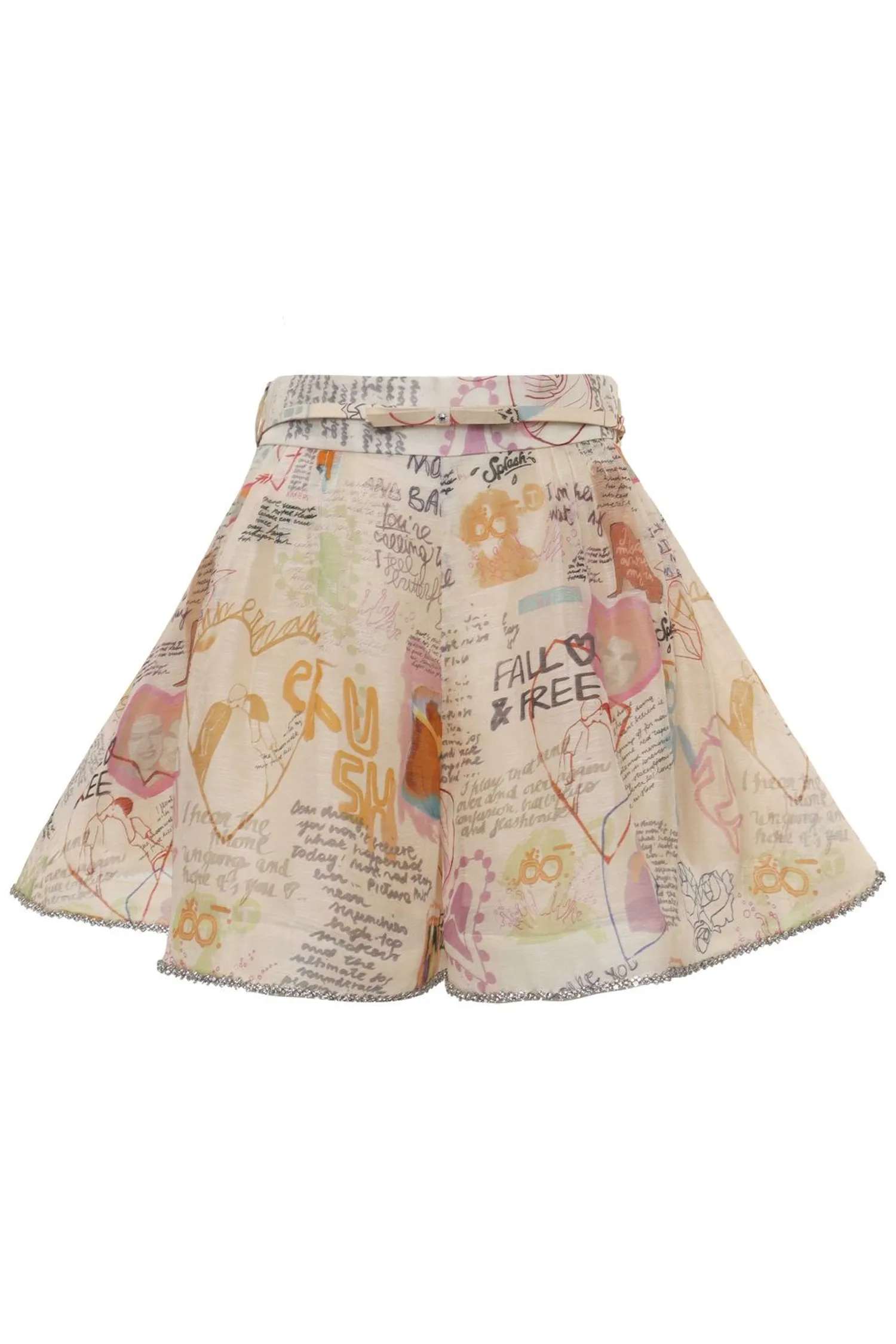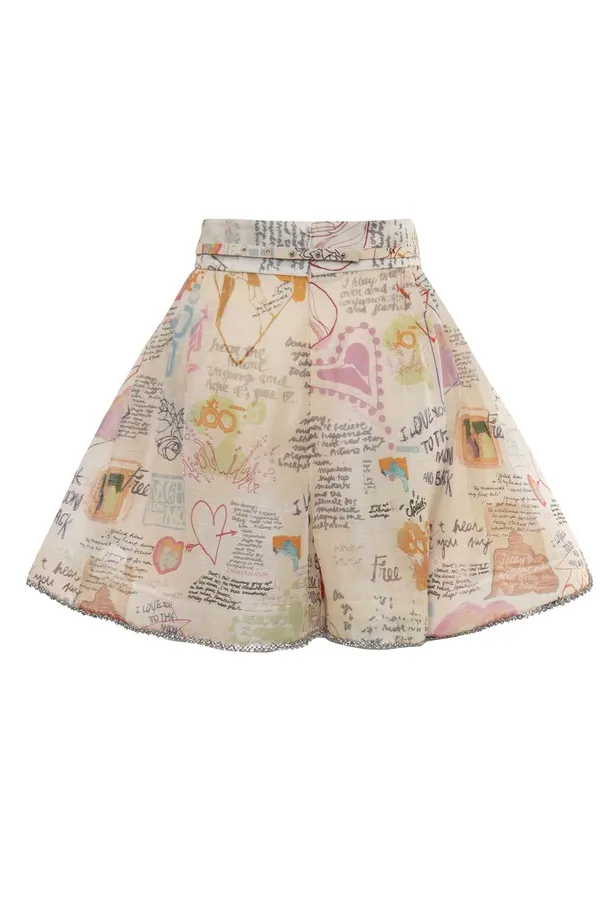 ШОРТЫ-ЮБКА МОЛОЧНЫЕ ЛЁН/ШЁЛК, ПРИНТ РИСУНКИ И НАДПИСИ, СНИЗУ ОТД.СТРАЗЫ