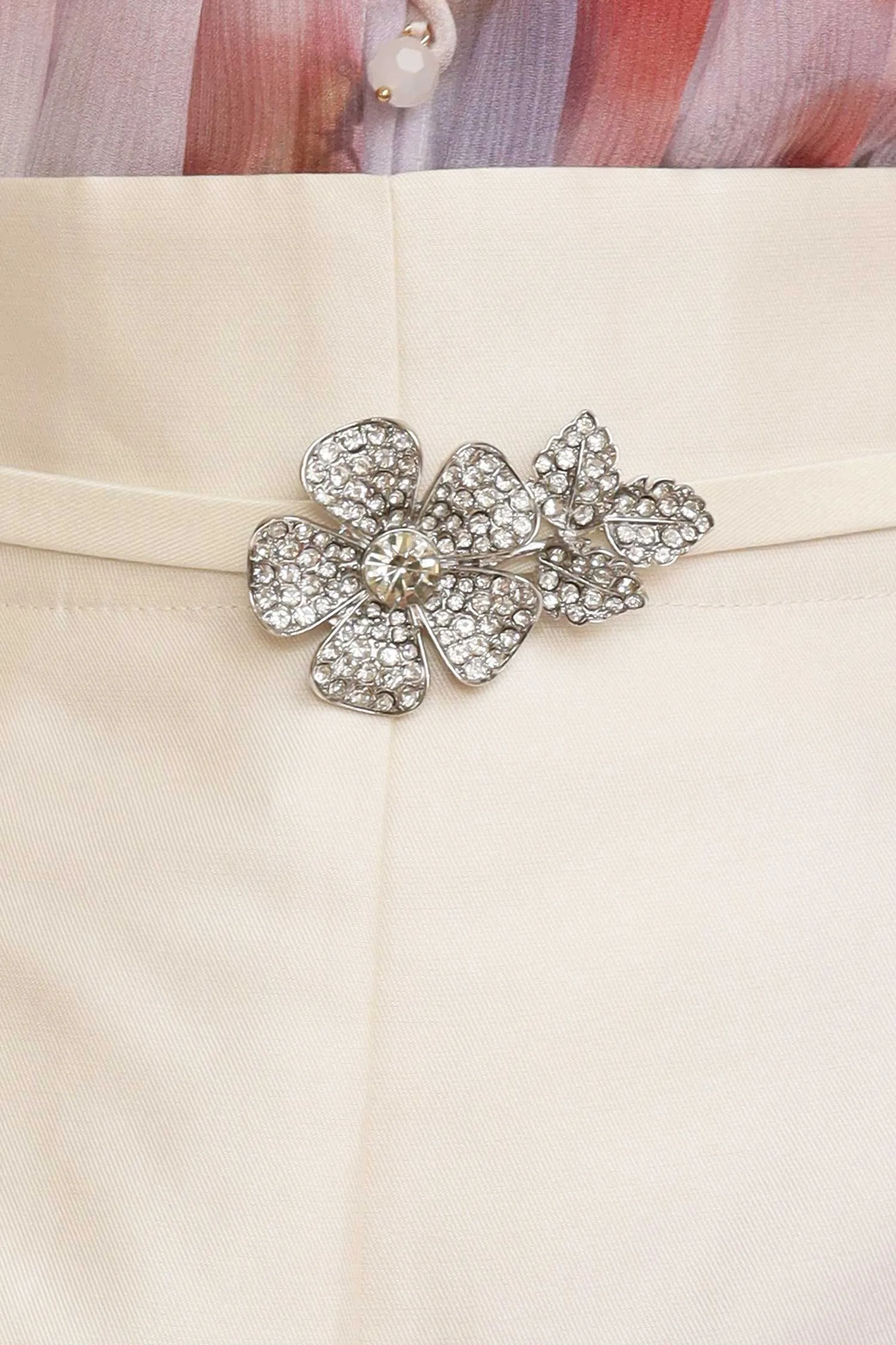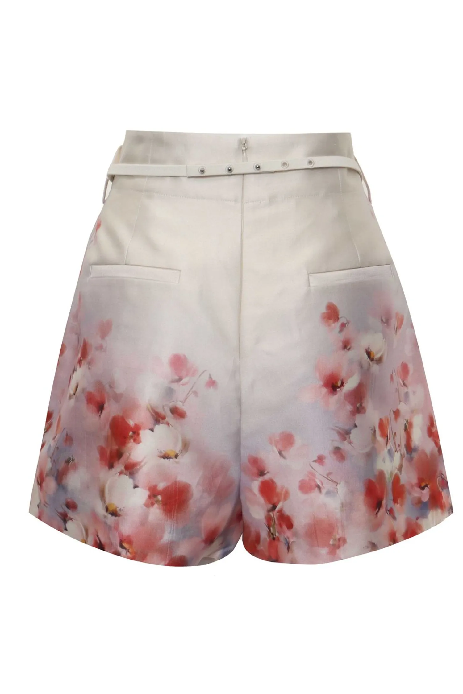 ШОРТЫ РОЗОВО-СИРЕНЕВО-МОЛОЧНЫЕ ШЁЛК, ПРИНТ ЦВЕТЫ, РЕМЕШОК С СЕРЕБРИСТОЙ ПРЯЖКОЙ В СТРАЗАХ