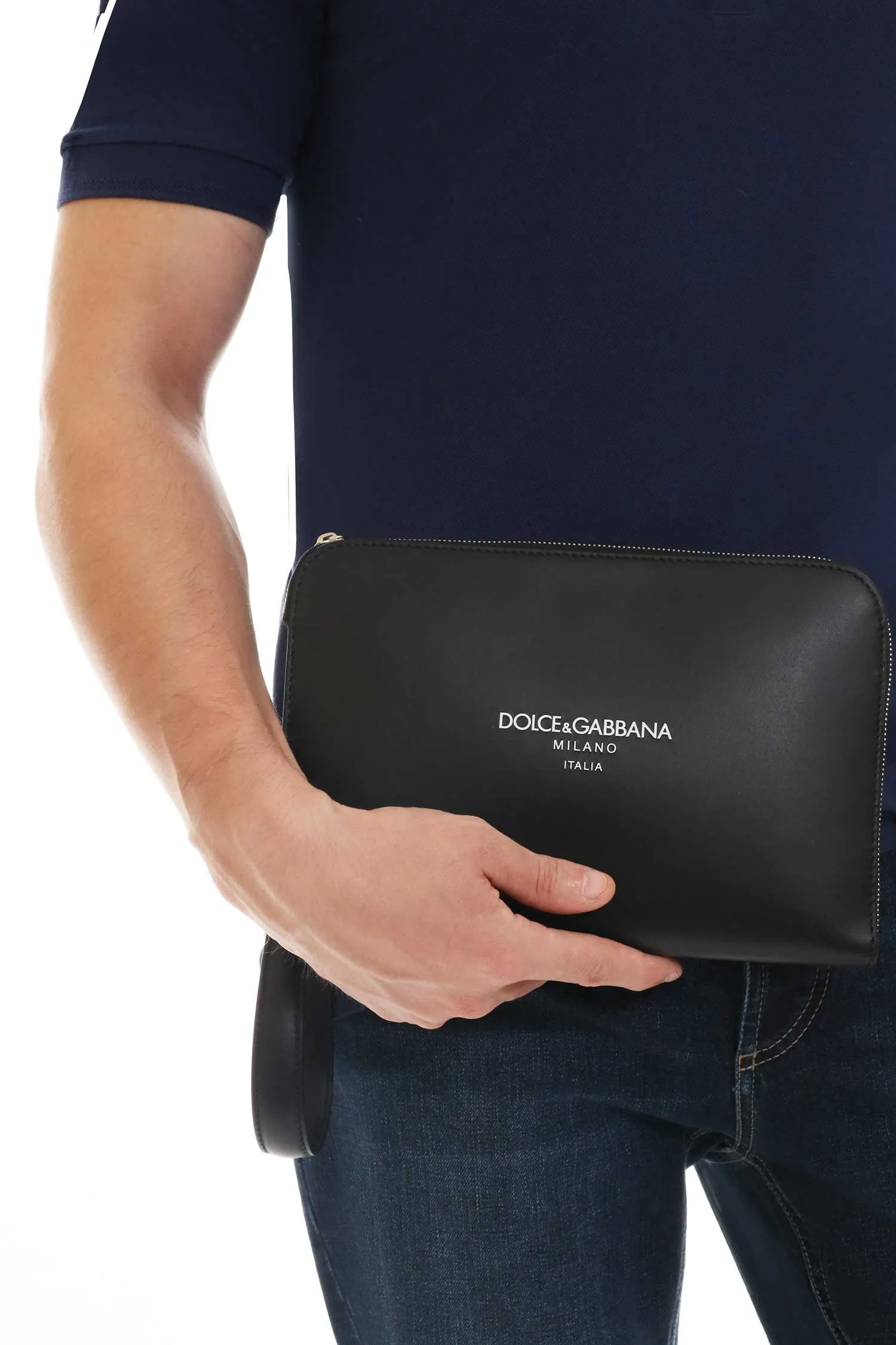 СУМКА-ПОРТМОНЕ ЧЁРНАЯ, МАТОВАЯ КОЖА, НА МОЛНИИ, БЕЛАЯ ЛОГО-НАДПИСЬ, РЕМЕШОК НА РУКУ