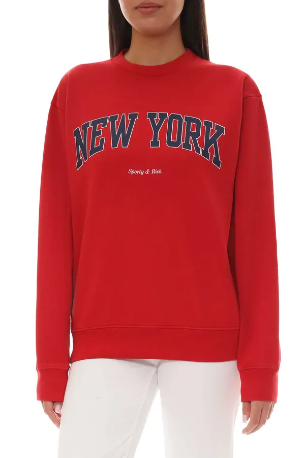 СВИТШОТ КРАСНЫЙ, УТЕПЛЁННЫЙ, НА ГРУДИ КРУПНАЯ Т/СИНЯЯ НАДПИСЬ NEW YORK