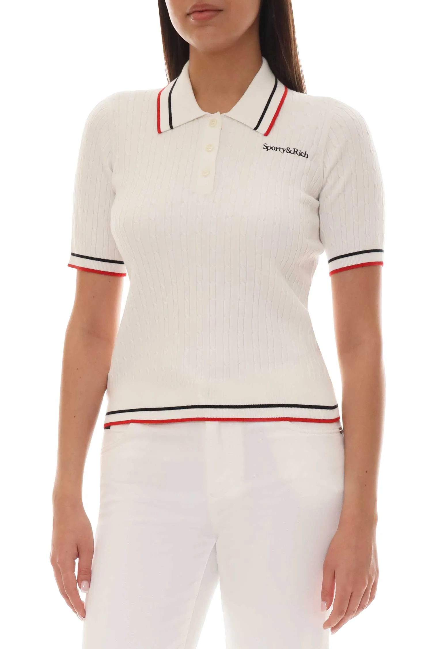 ДЖЕМПЕР-ПОЛО БЕЛЫЙ, ВЯЗКА КОСЫ, УКОРОЧЕННЫЙ, Т/СИНЯЯ/КРАСНАЯ ОКАНТОВКА, К/РУК.