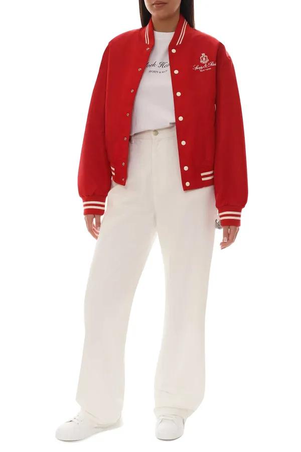 БОМБЕР КРАСНЫЙ НЕЙЛОН, УКОРОЧЕННЫЙ, НА КНОПКАХ, НА СПИНЕ ВЫШИТАЯ БЕЛАЯ ЛОГО-НАДПИСЬ+ГЕРБ, БЕЛЫЕ ПОЛОСЫ НА ВОРОТНИКЕ И МАНЖЕТАХ
