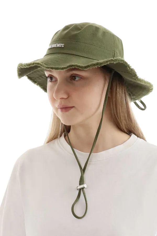 Панама Jacquemus Artichaut — аксессуар с характером. Необработанные края и серебристый логотип создают эффект расслабленного шика. Длинный шнурок с фиксатором позволяет надёжно зафиксировать шляпу, а хлопковый состав делает её лёгкой и комфортной даже в жару.