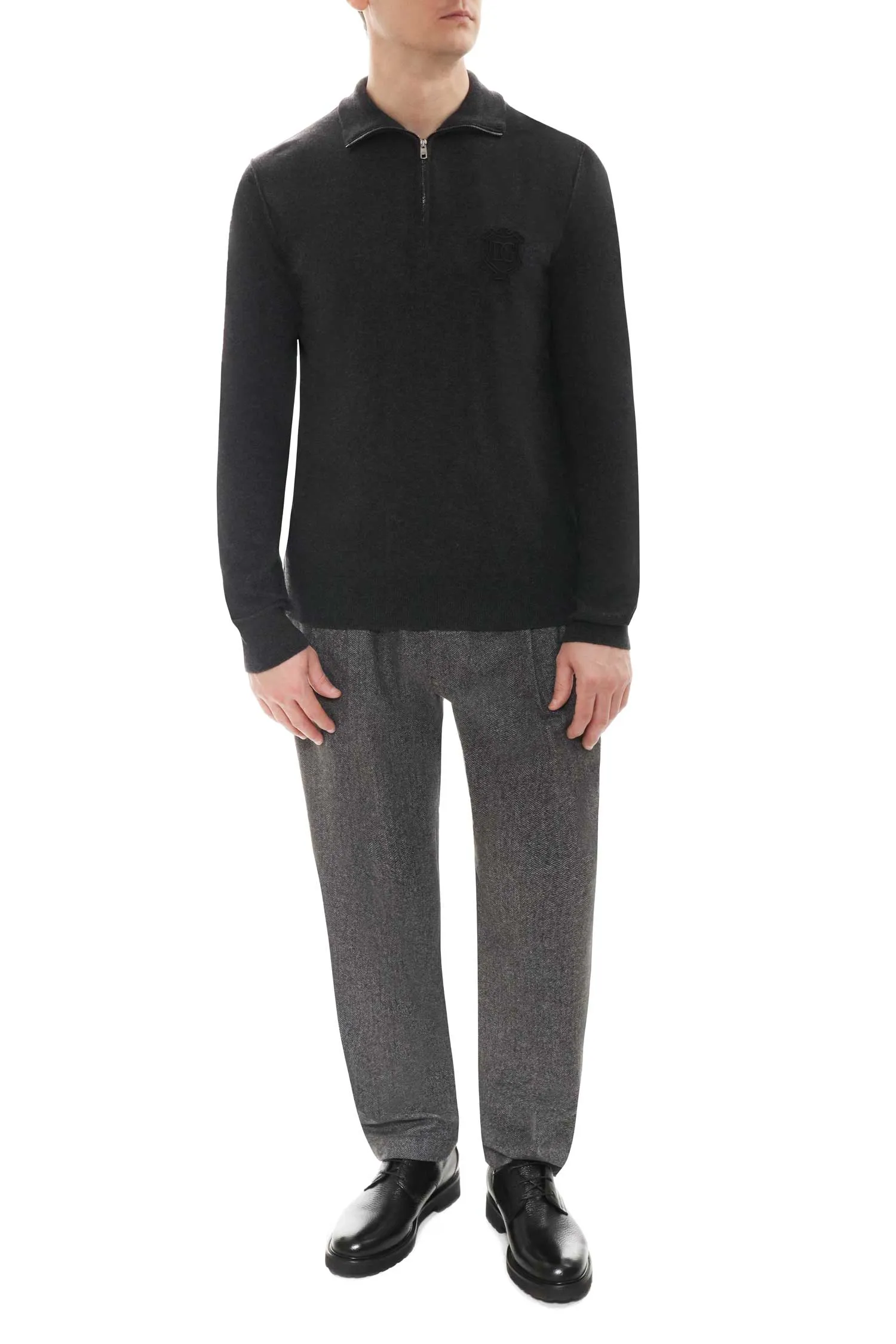 ДЖЕМПЕР Т/СЕРЫЙ КАШЕМИР, НА ГРУДИ НАШИВКА-ГЕРБ С ЛОГО DG, ВОРОТ-СТОЙКА НА МОЛНИИ