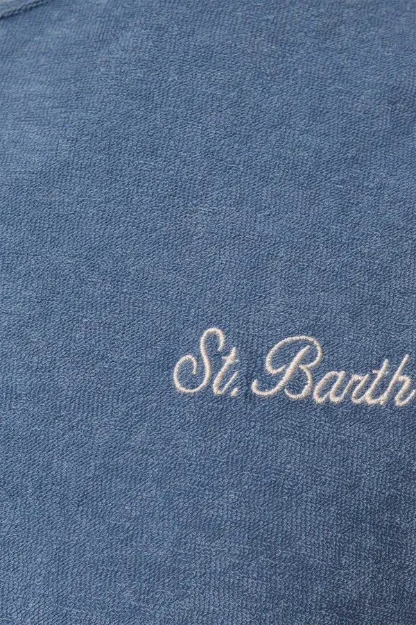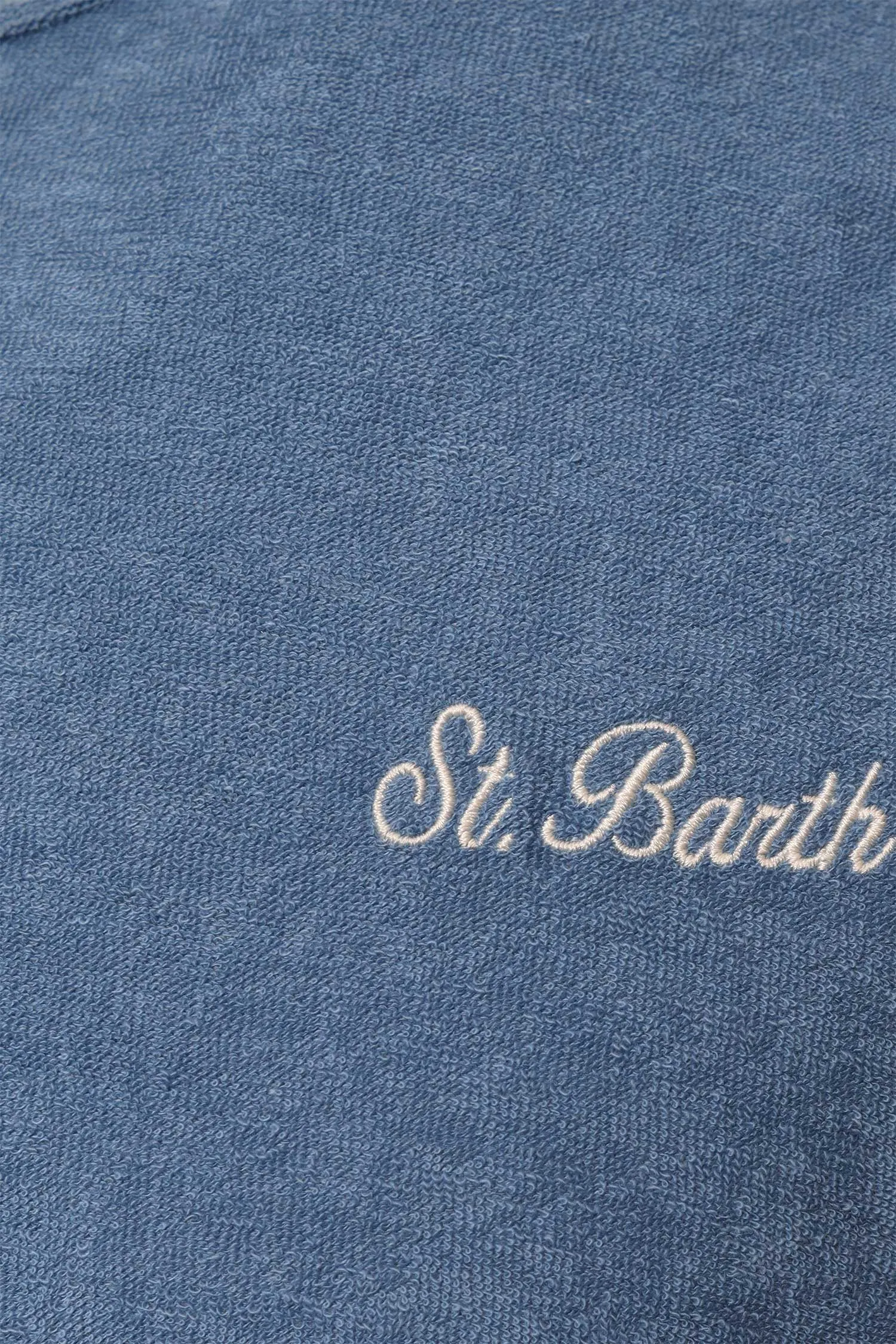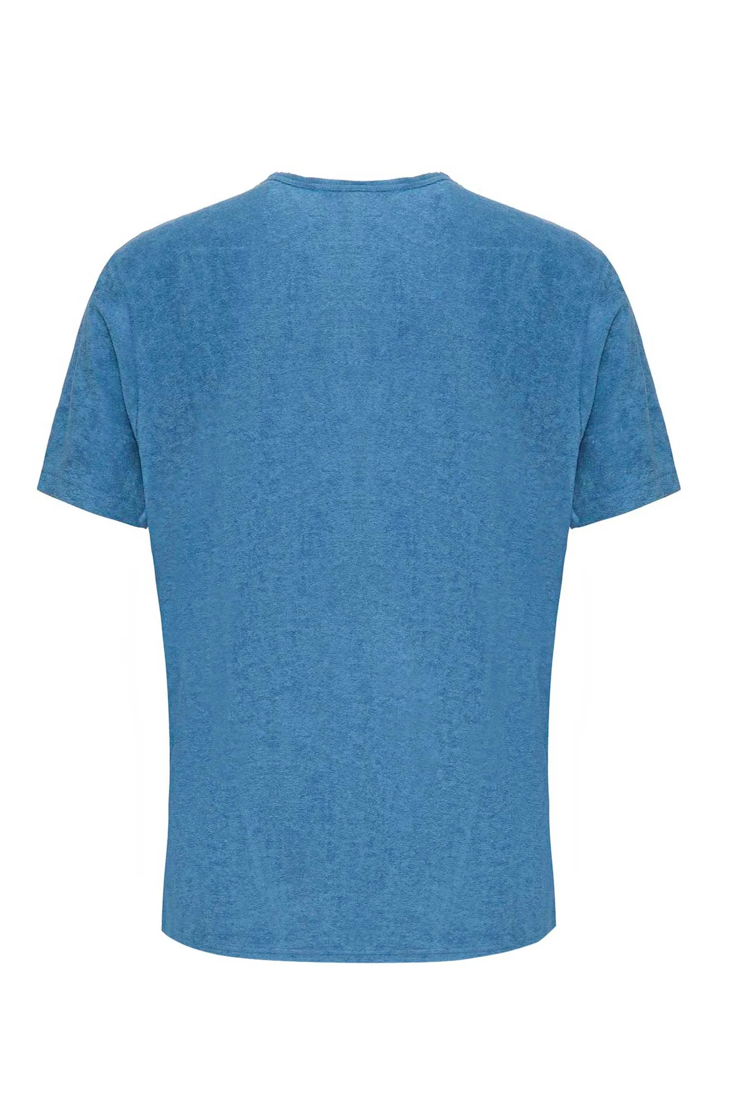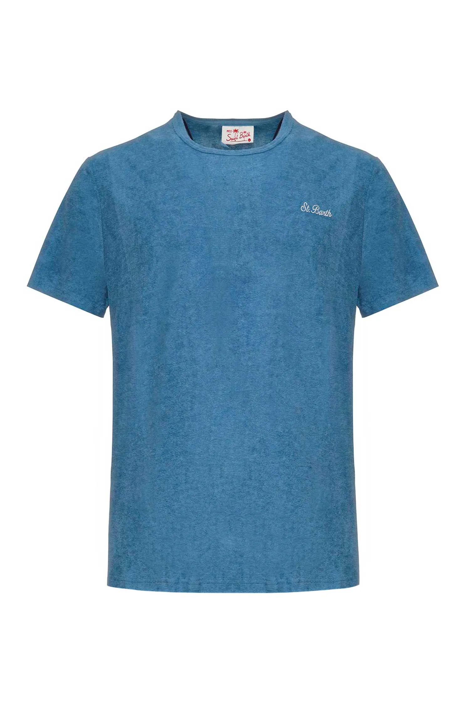 ФУТБОЛКА СИНЯЯ, МАХРОВАЯ, НА ГРУДИ ВЫШИТАЯ БЕЛАЯ ЛОГО-НАДПИСЬ