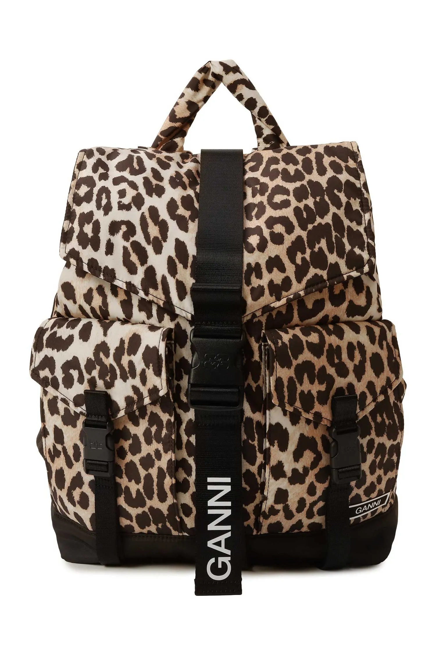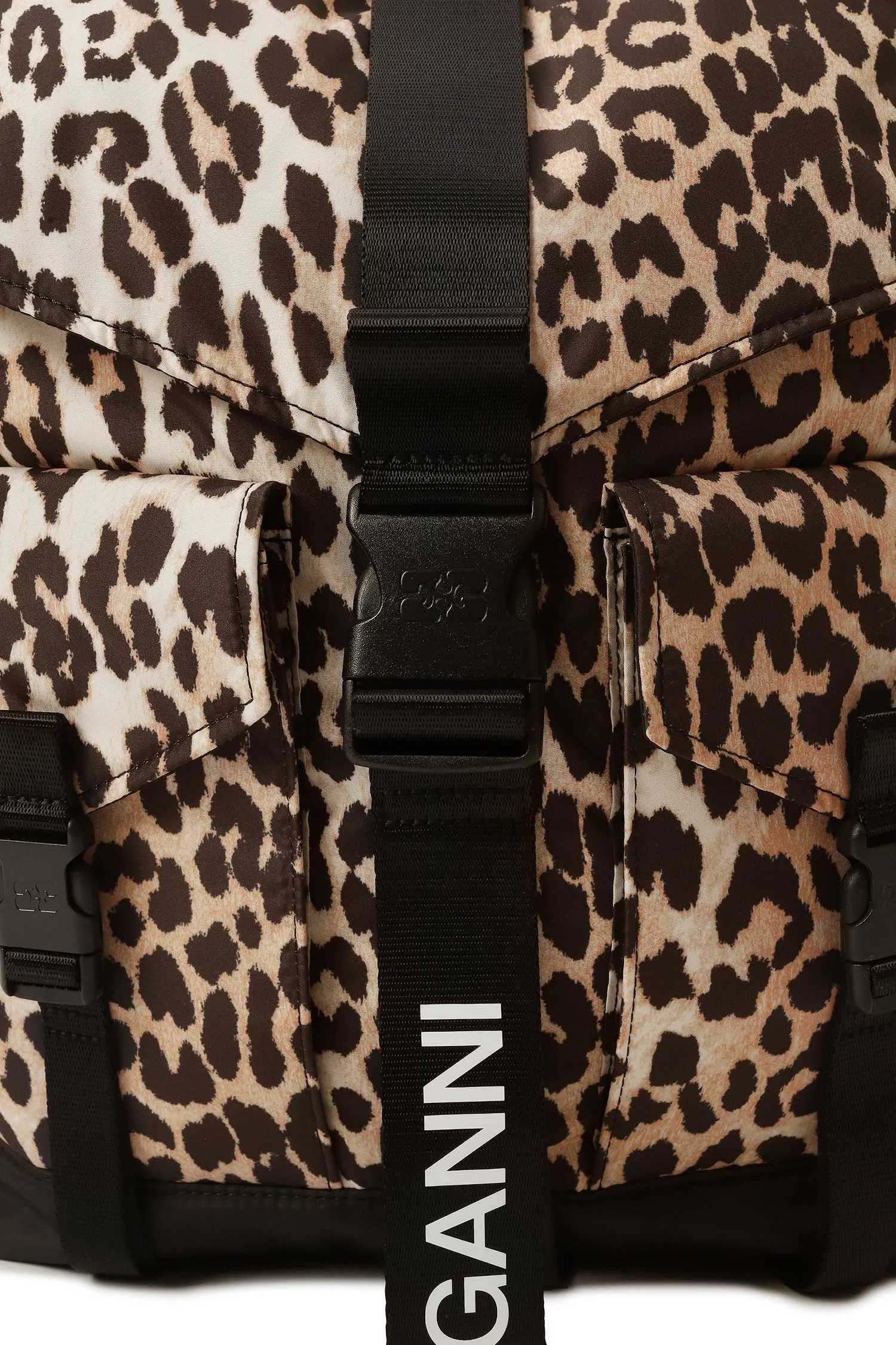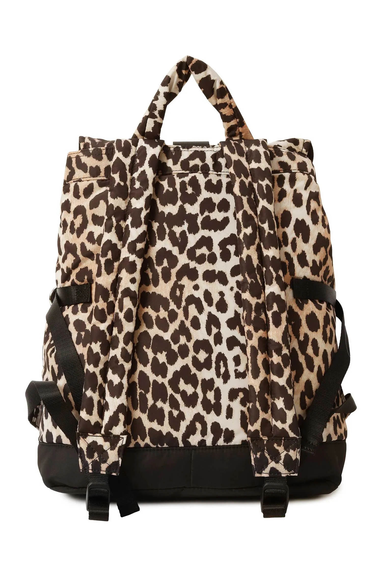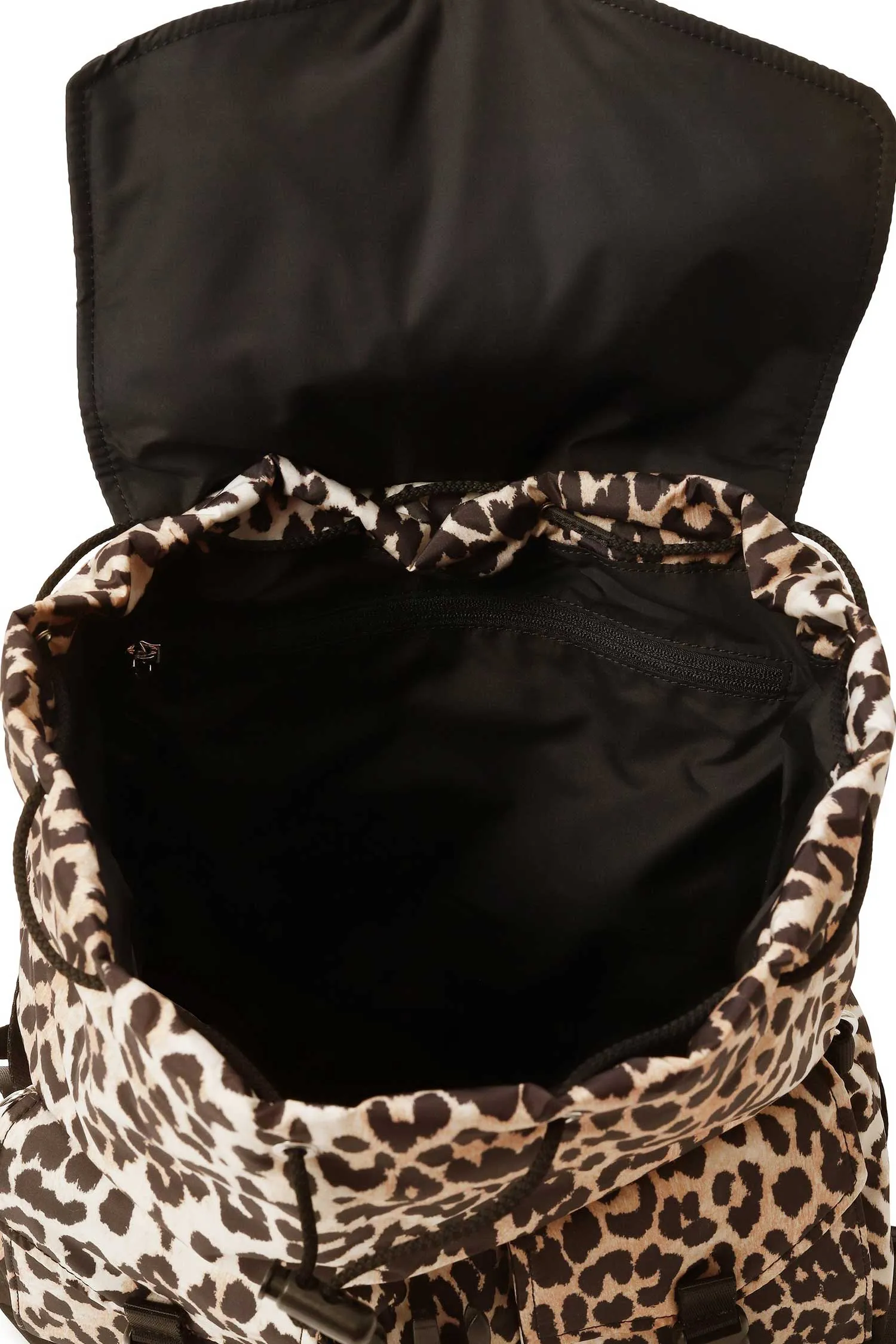 РЮКЗАК БЕЖЕВО-ЧЁРНЫЙ ИЗ НЕЙЛОНА, ПРИНТ ЛЕОПАРД, НА КУЛИСКЕ, С КЛАПАНОМ, НАКЛАДНЫЕ КАРМАНЫ, ЗАСТЁЖКИ-ФАСТЕКС, РУЧКА