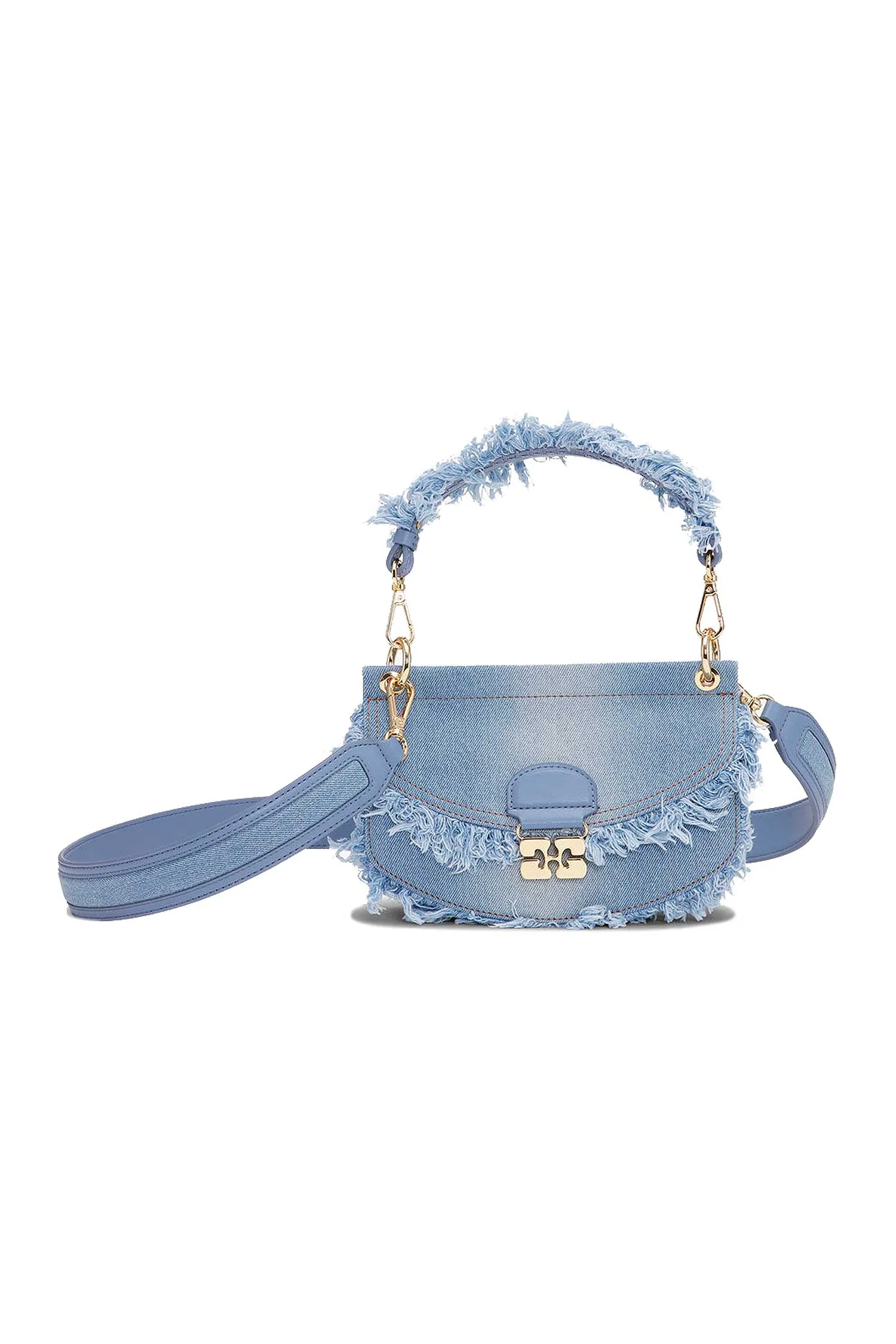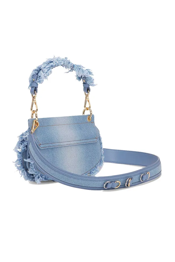 СУМКА ГОЛУБАЯ С БАХРОМОЙ, ДЖИНСОВАЯ, С КЛАПАНОМ, ЗОЛОТИСТАЯ ЗАСТЁЖКА-ЛОГО, РУЧКА, РЕМЕНЬ