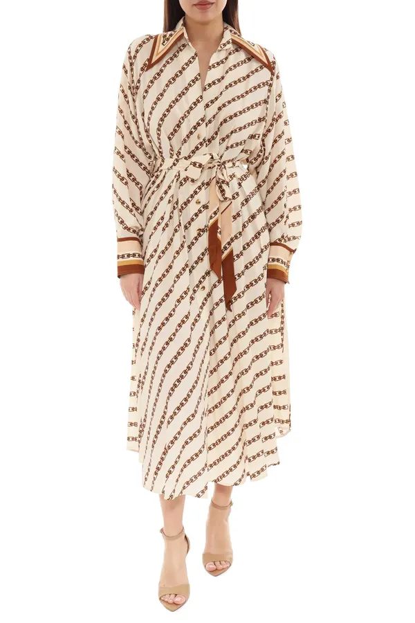 ПЛАТЬЕ-РУБАШКА МОЛОЧНОЕ ШЁЛК, КОРИЧНЕВЫЙ ПРИНТ ЦЕПИ, ДЛИННОЕ, НА ВОРОТНИКЕ И РУКАВАХ КОРИЧНЕВЫЕ ПОЛОСЫ, ПОЯС, ДЛ/РУК.