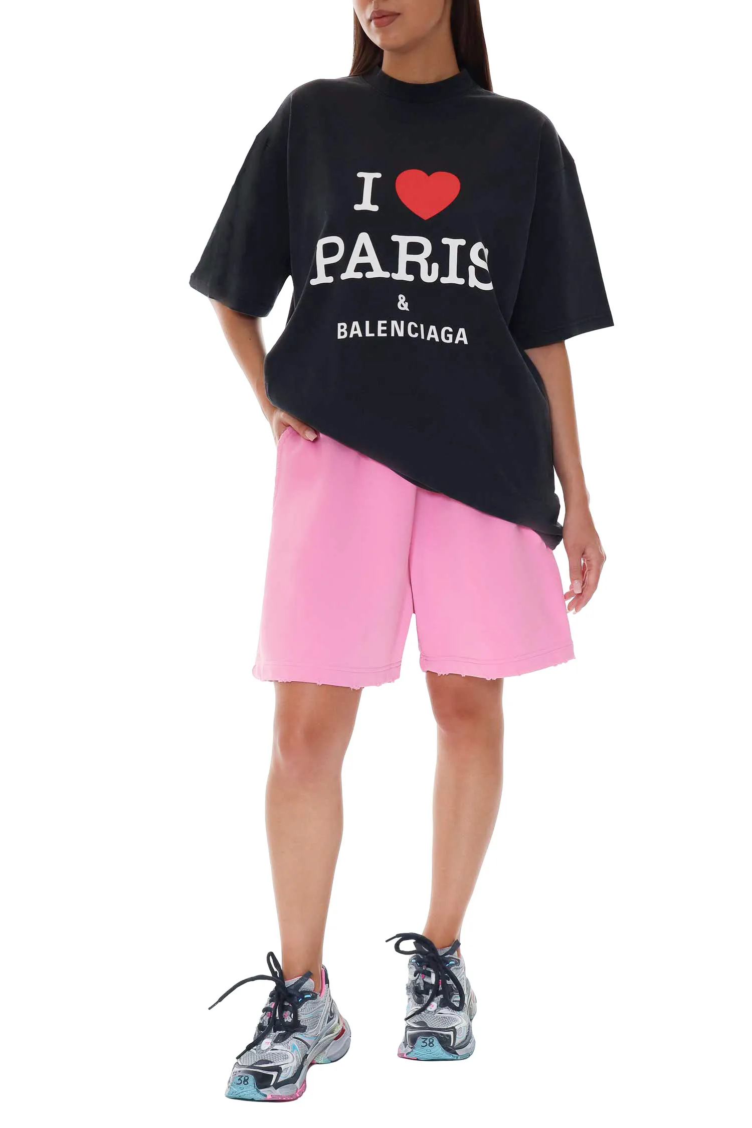 BALENCIAGA ФУТБОЛКА ЧЁРНАЯ, СВОБОДНАЯ, НА ГРУДИ КРУПНАЯ БЕЛАЯ НАДПИСЬ I LOVE PARIS, ЛОГО-НАДПИСЬ