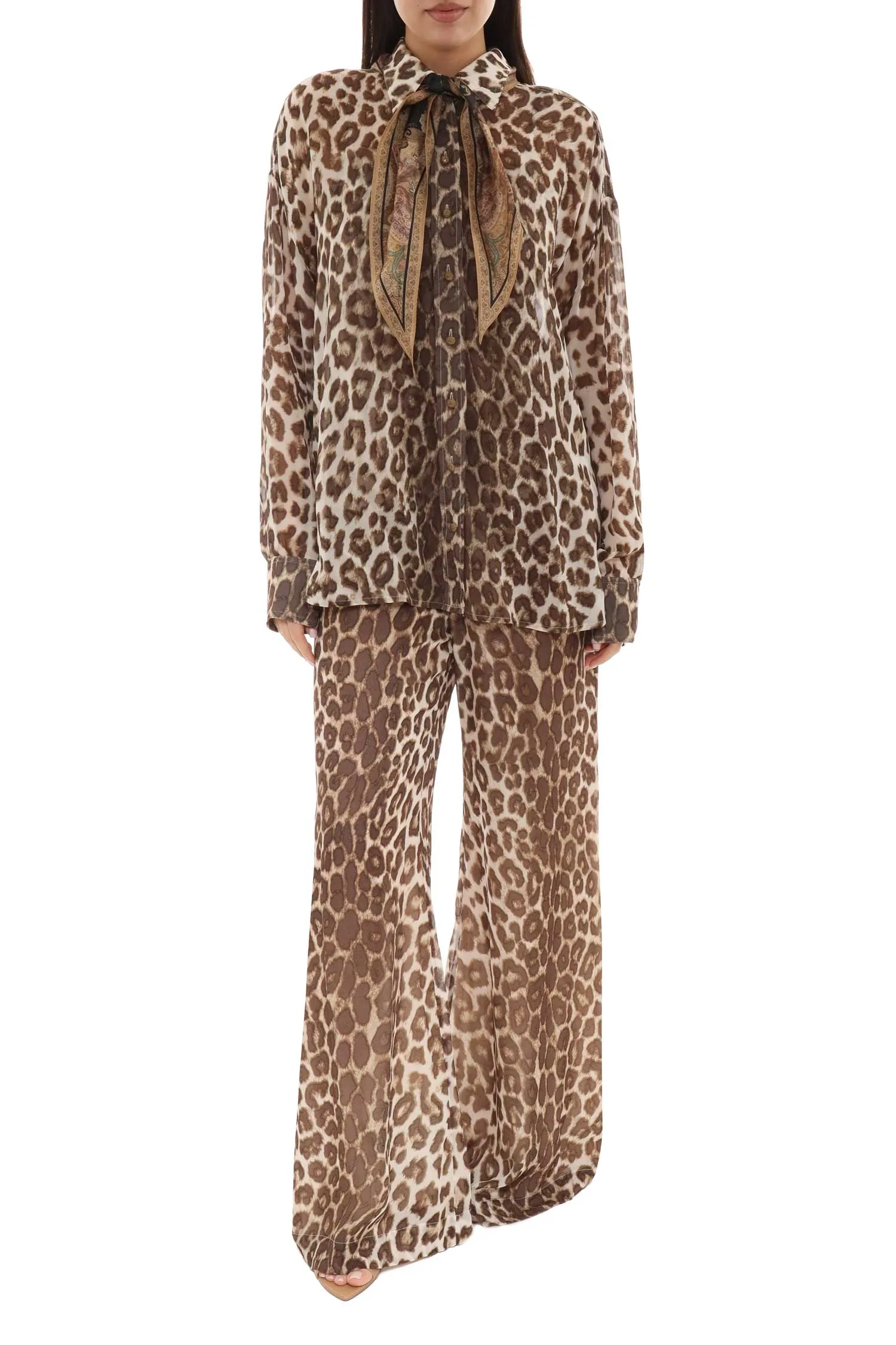 РУБАШКА МОЛОЧНО-КОРИЧНЕВАЯ ШИФОН, ПРИНТ ЛЕОПАРД, ПЛАТОК ШЁЛК С ОРНАМЕНТОМ