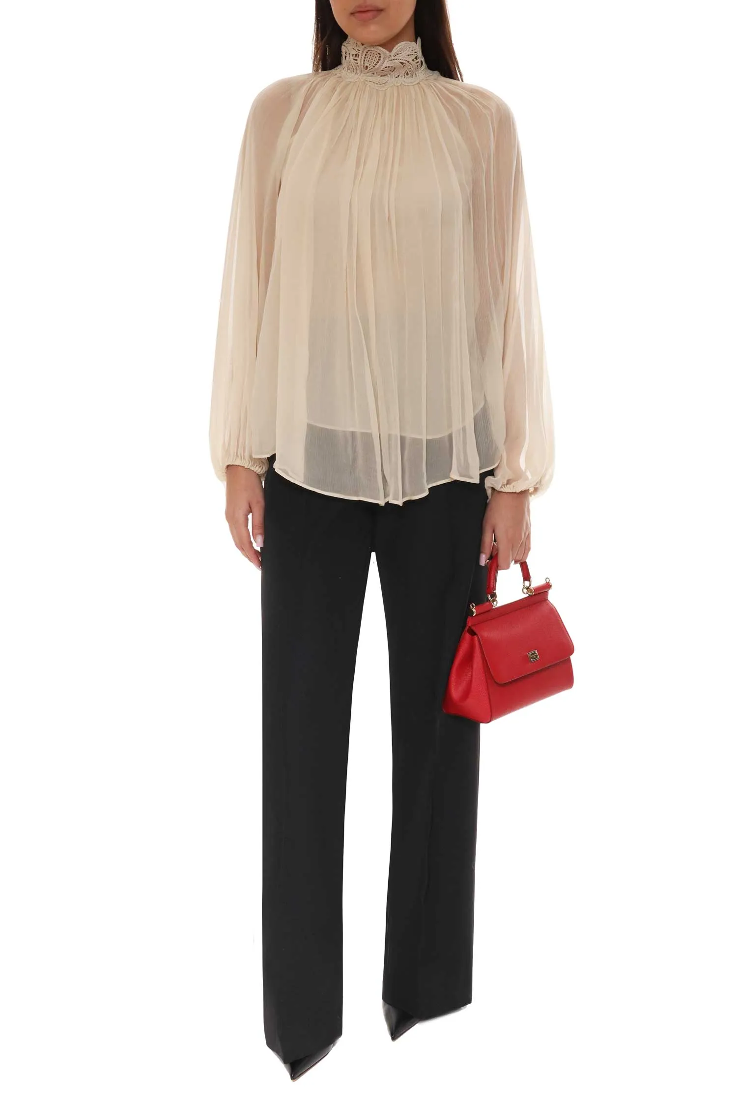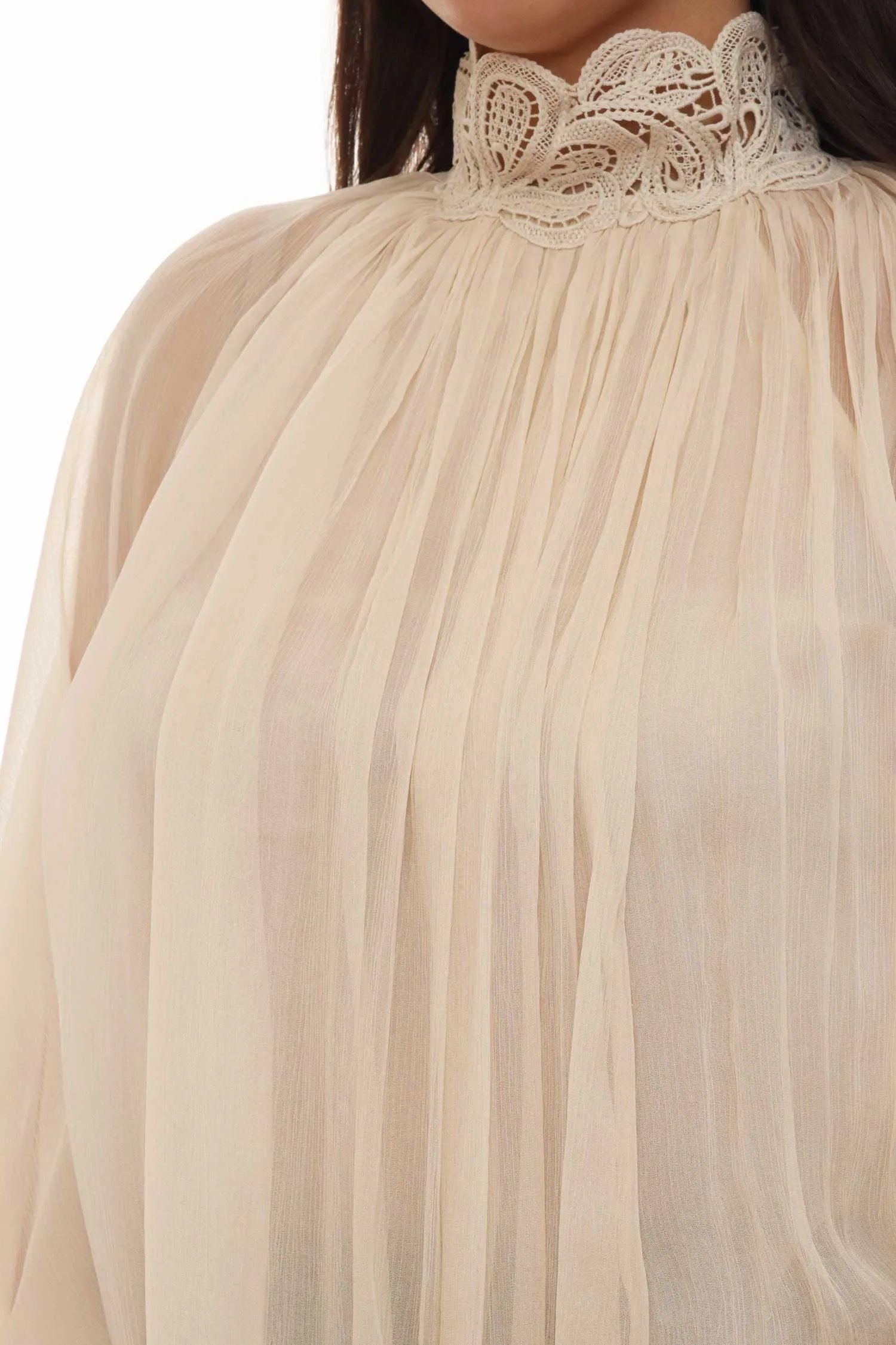 БЛУЗА МОЛОЧНАЯ ШИФОН, РУКАВ ЛЕТУЧАЯ МЫШЬ, ВОРОТ-СТОЙКА ОТД.КРУЖЕВО В ТОН