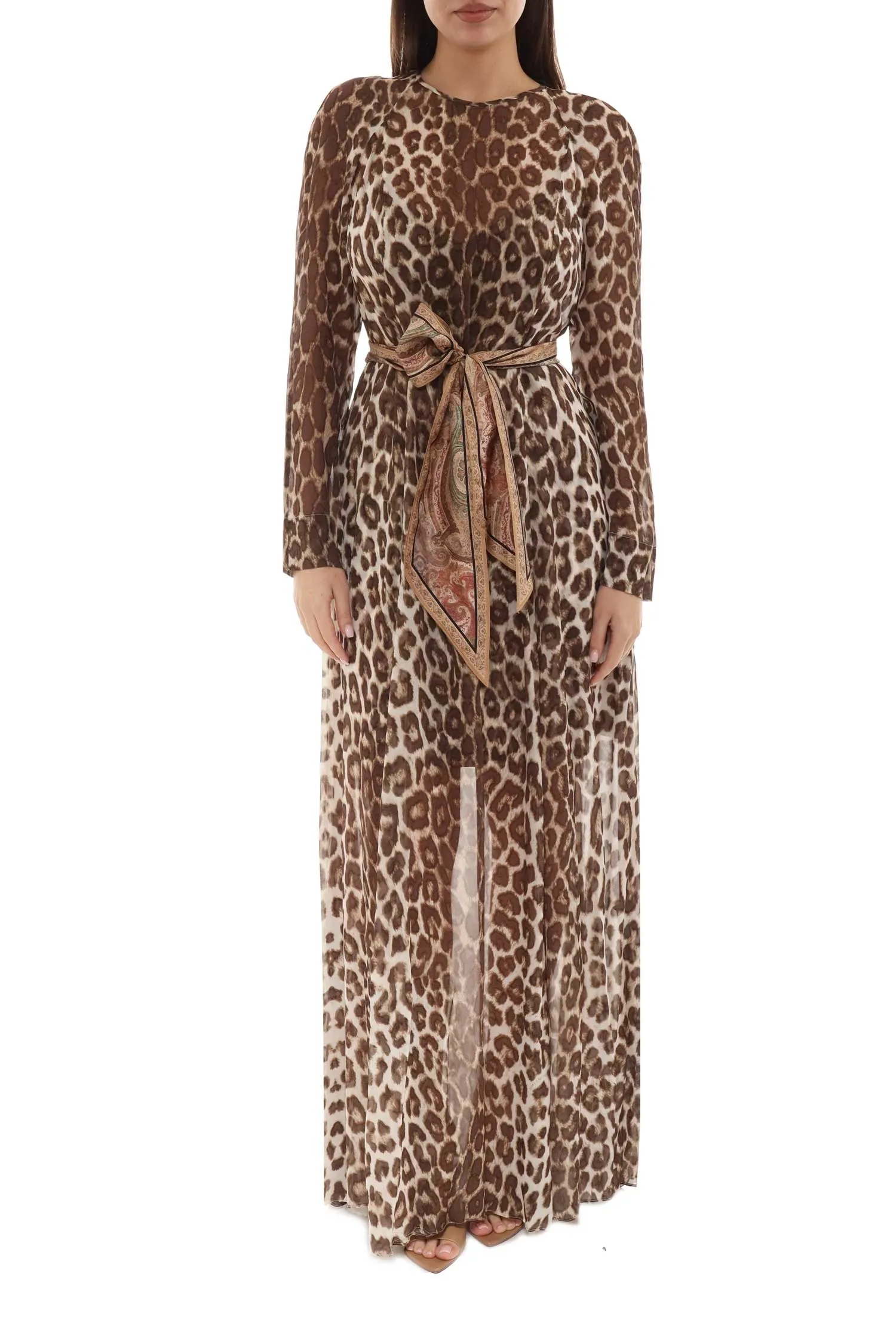 ПЛАТЬЕ МОЛОЧНО-КОРИЧНЕВОЕ ШИФОН, ПРИНТ ЛЕОПАРД, ДЛИННОЕ, ШЁЛК.ПОЯС С ОРНАМЕНТОМ, СОРОЧКА, ДЛ/РУК.