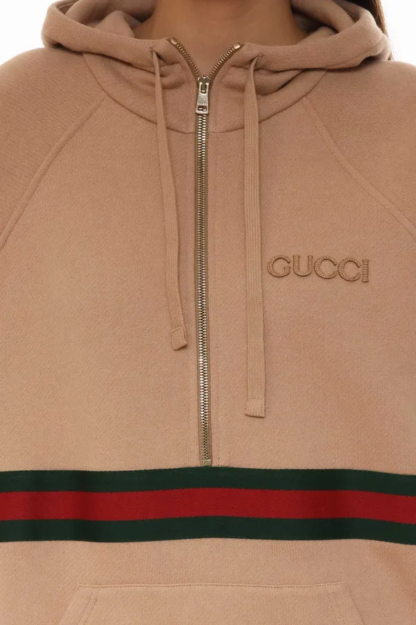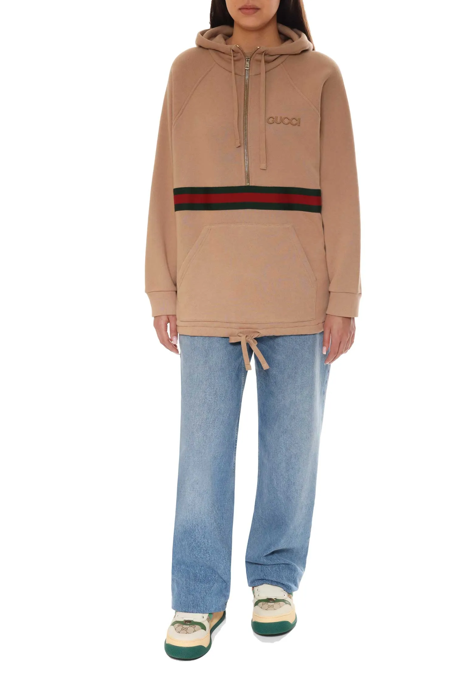 ХУДИ БЕЖЕВОЕ, НА ГРУДИ ГОРИЗОНТ.КРАСНО-ЗЕЛЁНАЯ ЛЕНТА WEB, ВОРОТ НА МОЛНИИ, КАПЮШОН