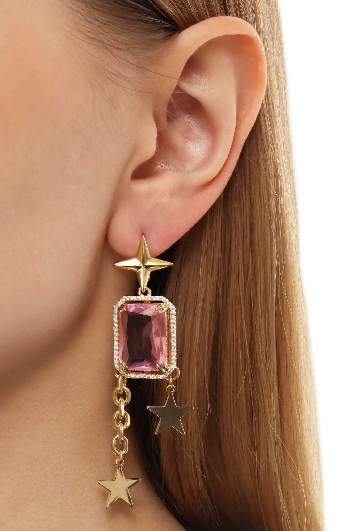 СЕРЬГИ SOZVEZDIYE ЗОЛОТИСТЫЕ, ПОДВЕСКА-РОЗОВЫЙ КВАДРАТНЫЙ ФИАНИТ, ЗВЁЗДЫ