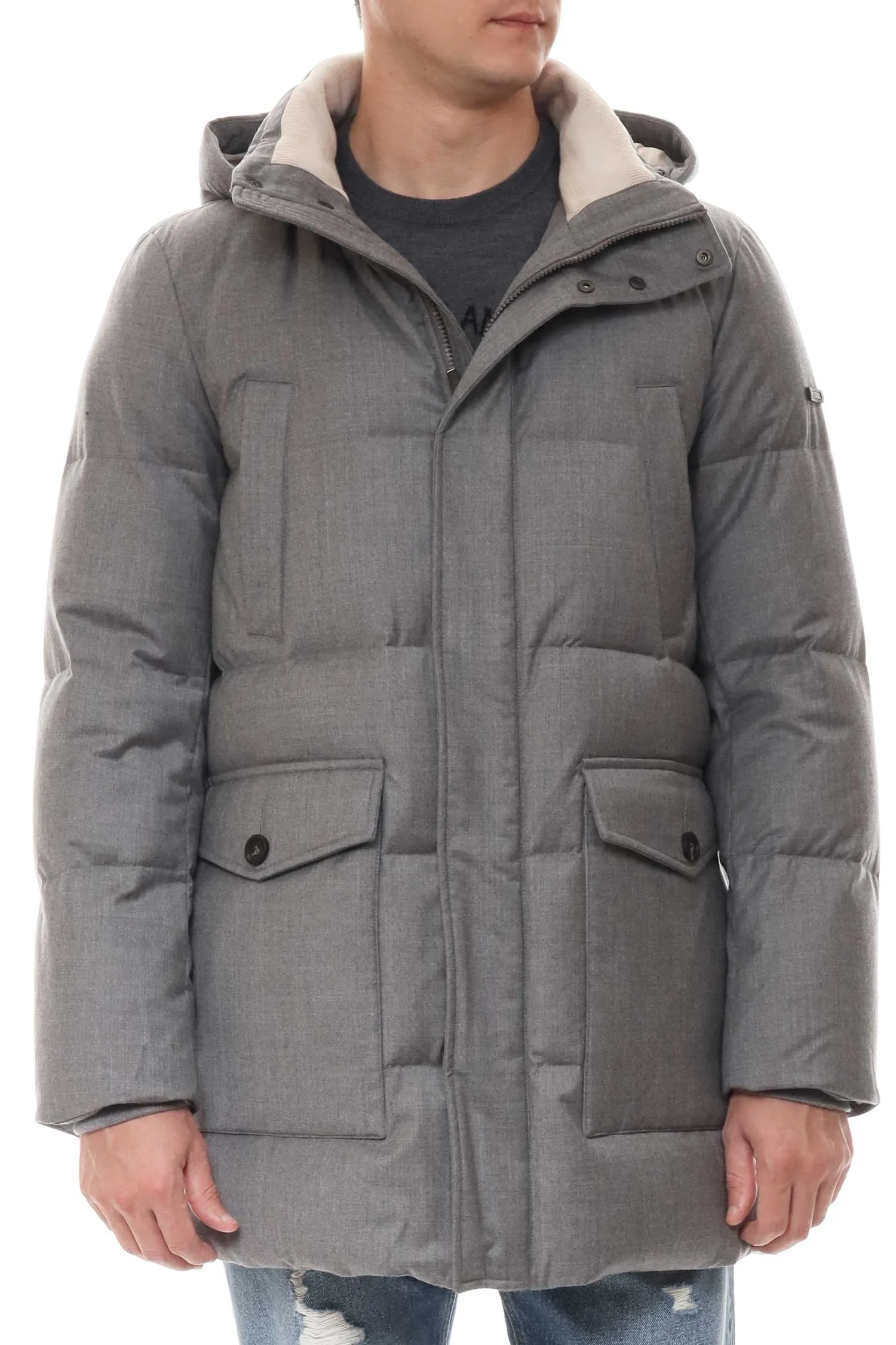 ПУХОВИК СЕРЫЙ ШЕРСТЬ, СТЁГАНЫЙ, НАКЛАДНЫЕ КАРМАНЫ С КЛАПАНОМ, ТРИКОТАЖНЫЕ МАНЖЕТЫ, КАПЮШОН НА КУЛИСКЕ, ВОРОТ-СТОЙКА