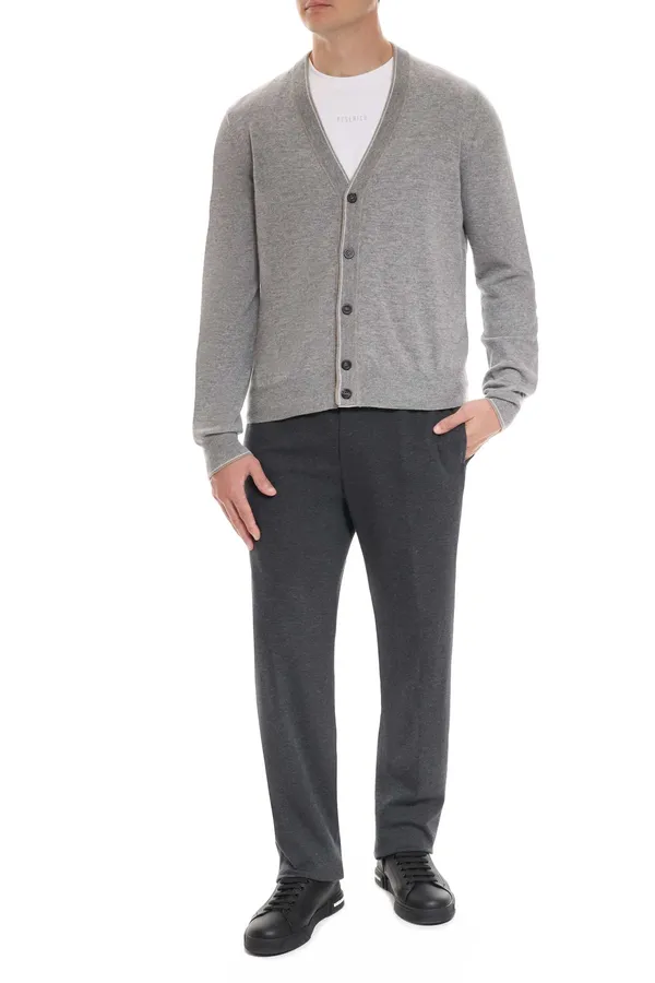 КАРДИГАН СЕРЫЙ ШЕРСТЬ/КАШЕМИР, НА ПУГОВИЦАХ, БЕЖЕВЫЕ/БЕЛЫЕ ПОЛОСЫ НА ВОРОТЕ И МАНЖЕТАХ