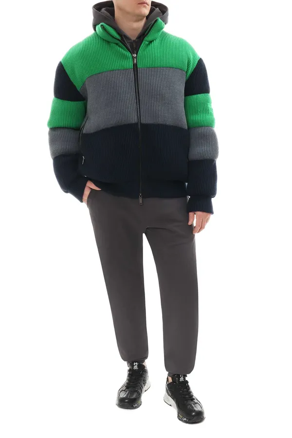 Трикотажный пуховик сочетает мягкость шерстяного полотна и практичность синтетического наполнителя, обеспечивающего тепло без утяжеления. Ворот-стойка и карманы на молнии добавляют функциональности, а фирменные детали подчёркивают современный характер изделия. Лёгкая фактура и лаконичный крой делают изделие универсальным выбором для динамичного ритма города.