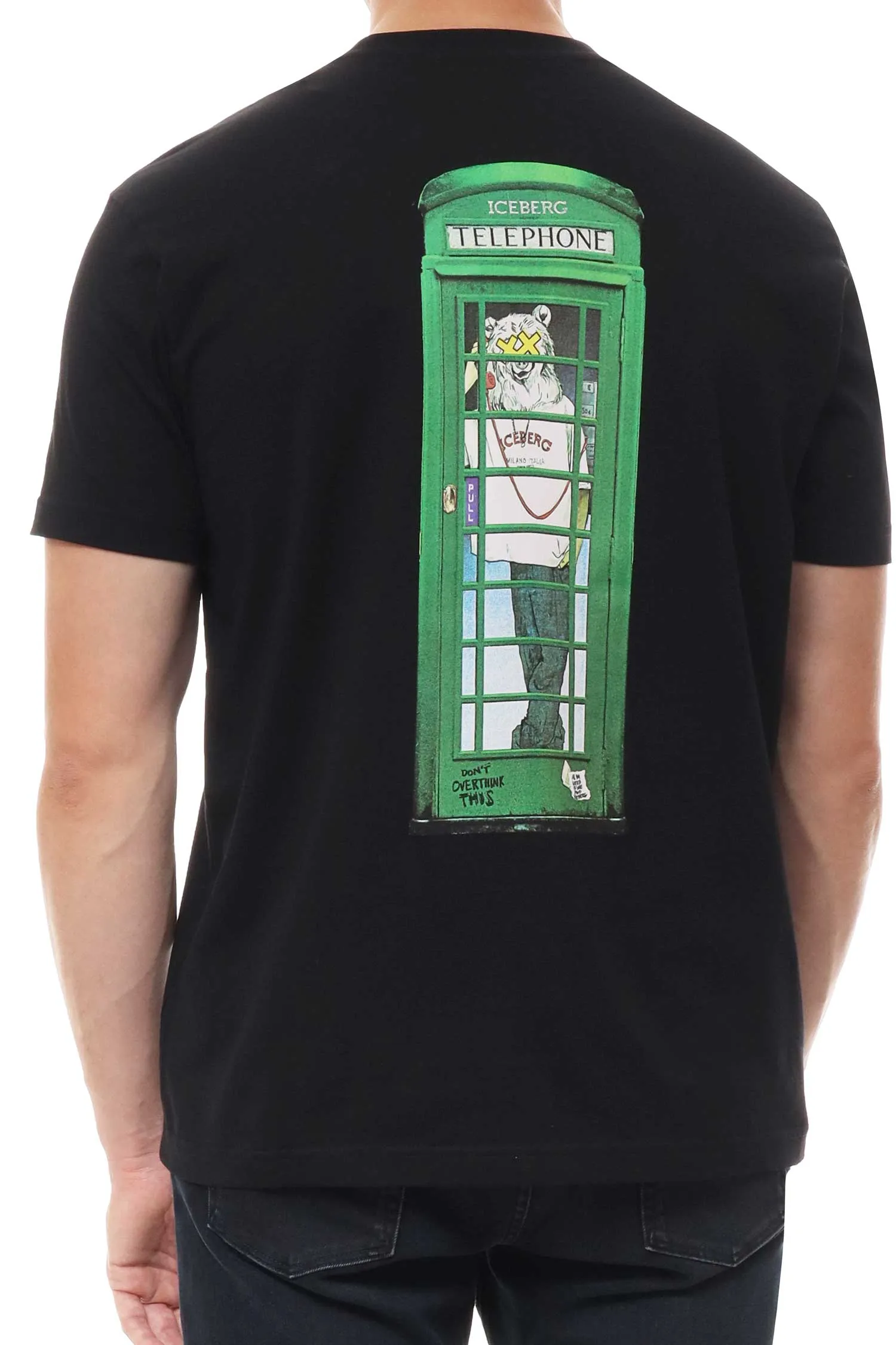 ФУТБОЛКА ЧЁРНАЯ, НА ГРУДИ ЗЕЛЁНОЕ ВЫШИТОЕ ЛОГО, НА СПИНЕ РИСУНОК ТЕЛЕФОН.БУДКА