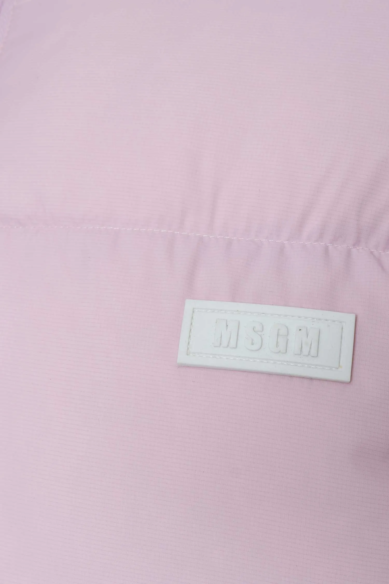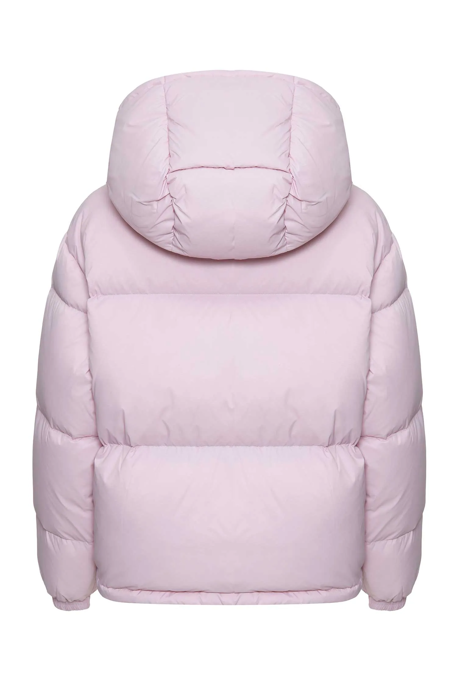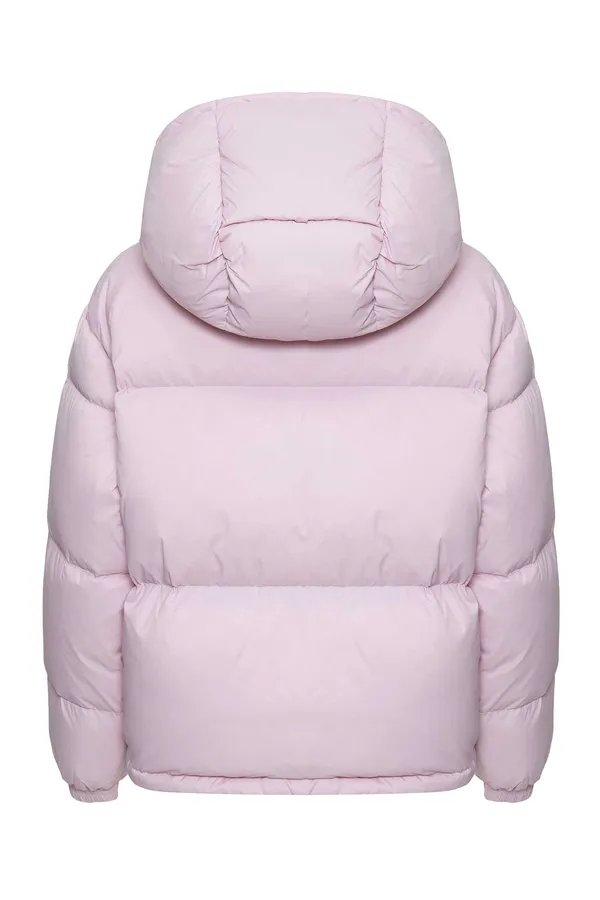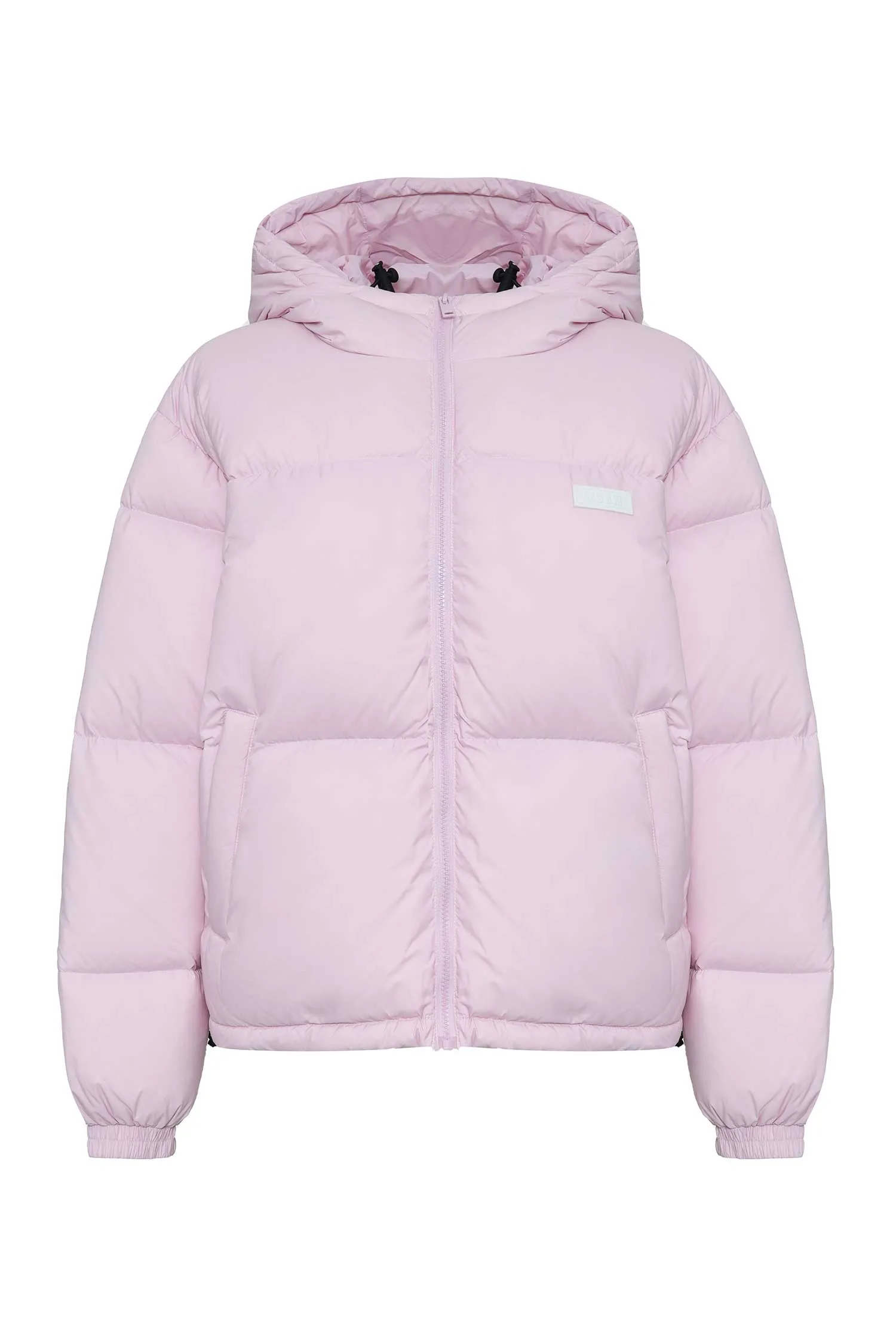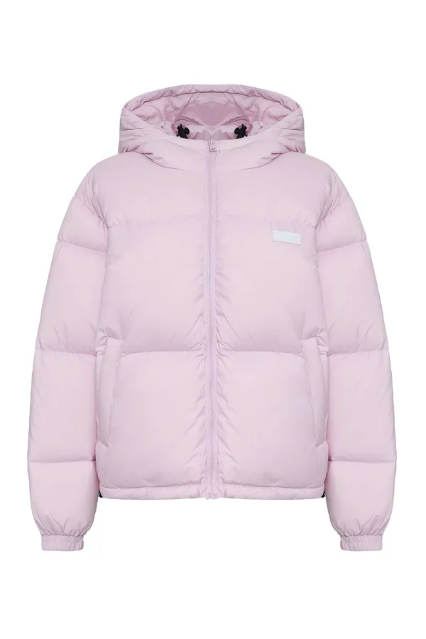 ПУХОВИК СВ/РОЗОВЫЙ, СТЁГАНЫЙ, КОРОТКИЙ, НА ГРУДИ БЕЛАЯ НАШИВКА-ЛОГО, КАПЮШОН