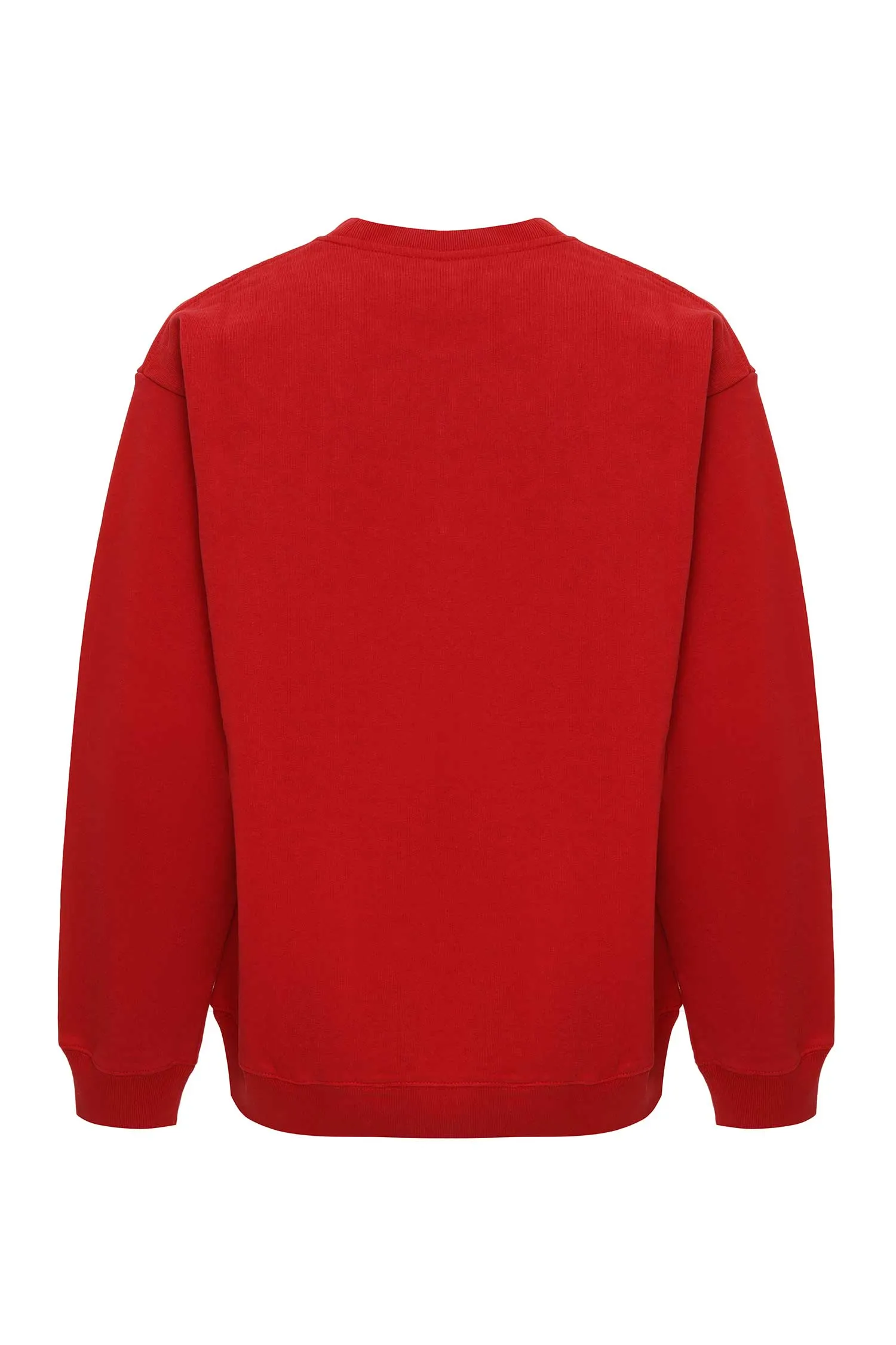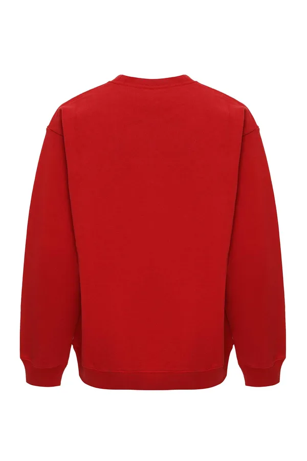 СВИТШОТ КРАСНЫЙ, УТЕПЛЁННЫЙ, НА ГРУДИ КРУГЛОЕ БЕЛОЕ ЛОГО, НАДПИСИ