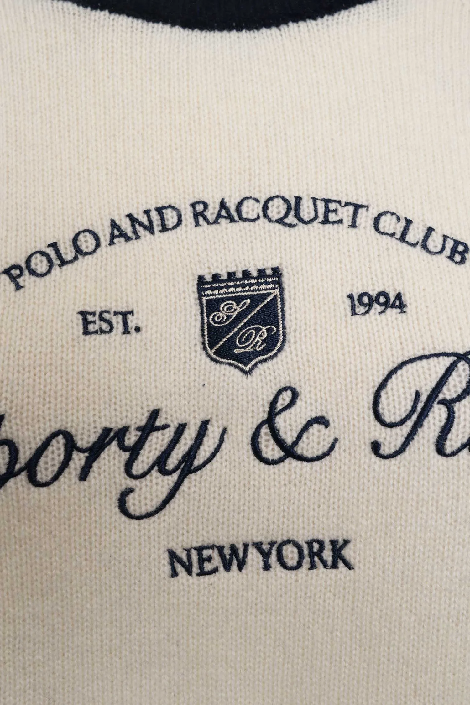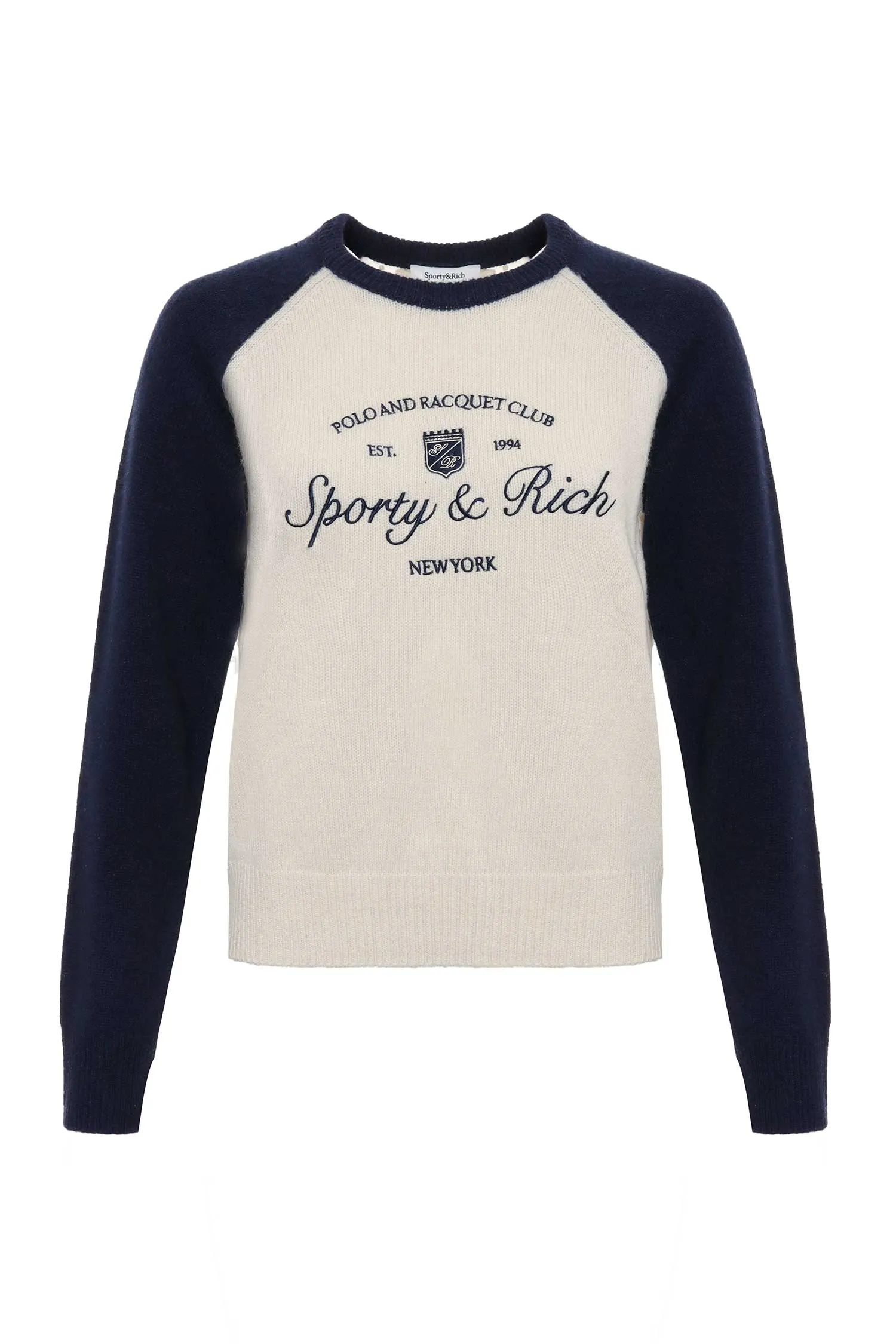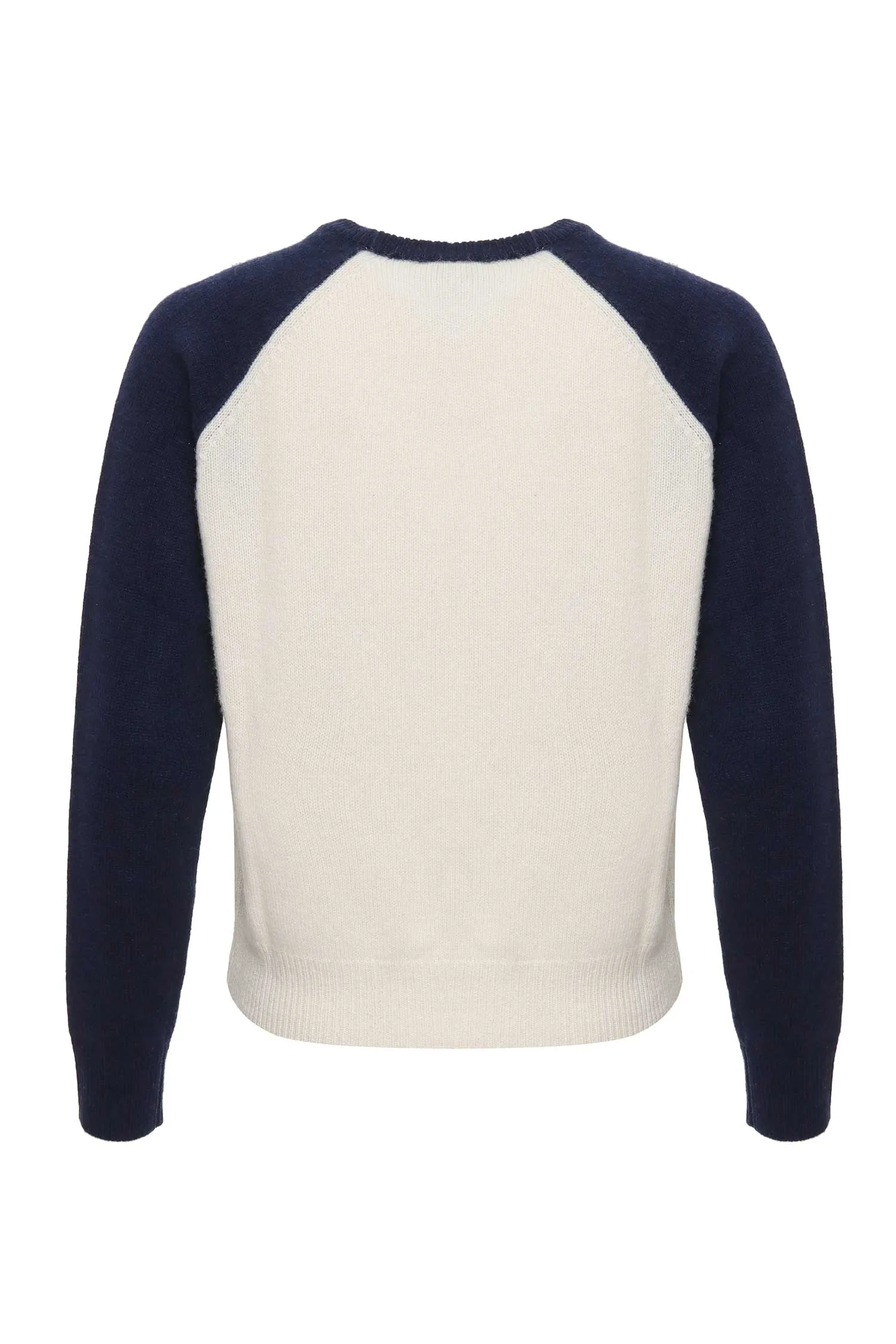 ДЖЕМПЕР МОЛОЧНЫЙ С Т/СИНИМИ РУКАВАМИ, КАШЕМИР/ШЕРСТЬ, НА ГРУДИ ВЫШИТЫЙ ГЕРБ, ЛОГО-НАДПИСЬ