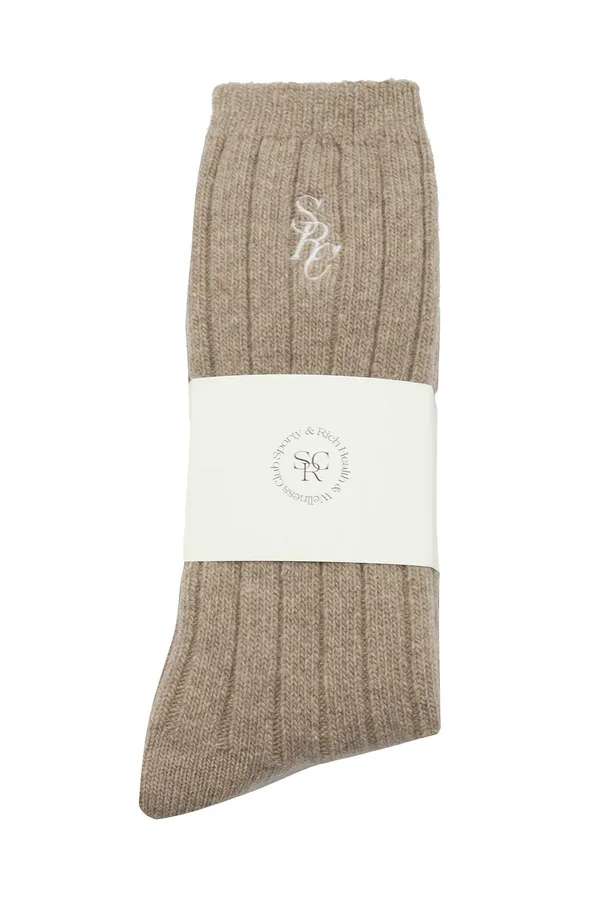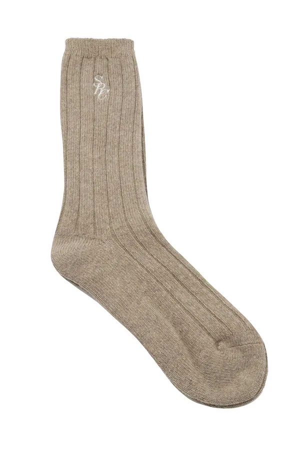 НОСКИ БЕЖЕВО-КОРИЧНЕВЫЕ ИЗ КАШЕМИРА И ШЕРСТИ, ВЫШИТЫЕ БЕЛЫЕ ЛОГО-БУКВЫ