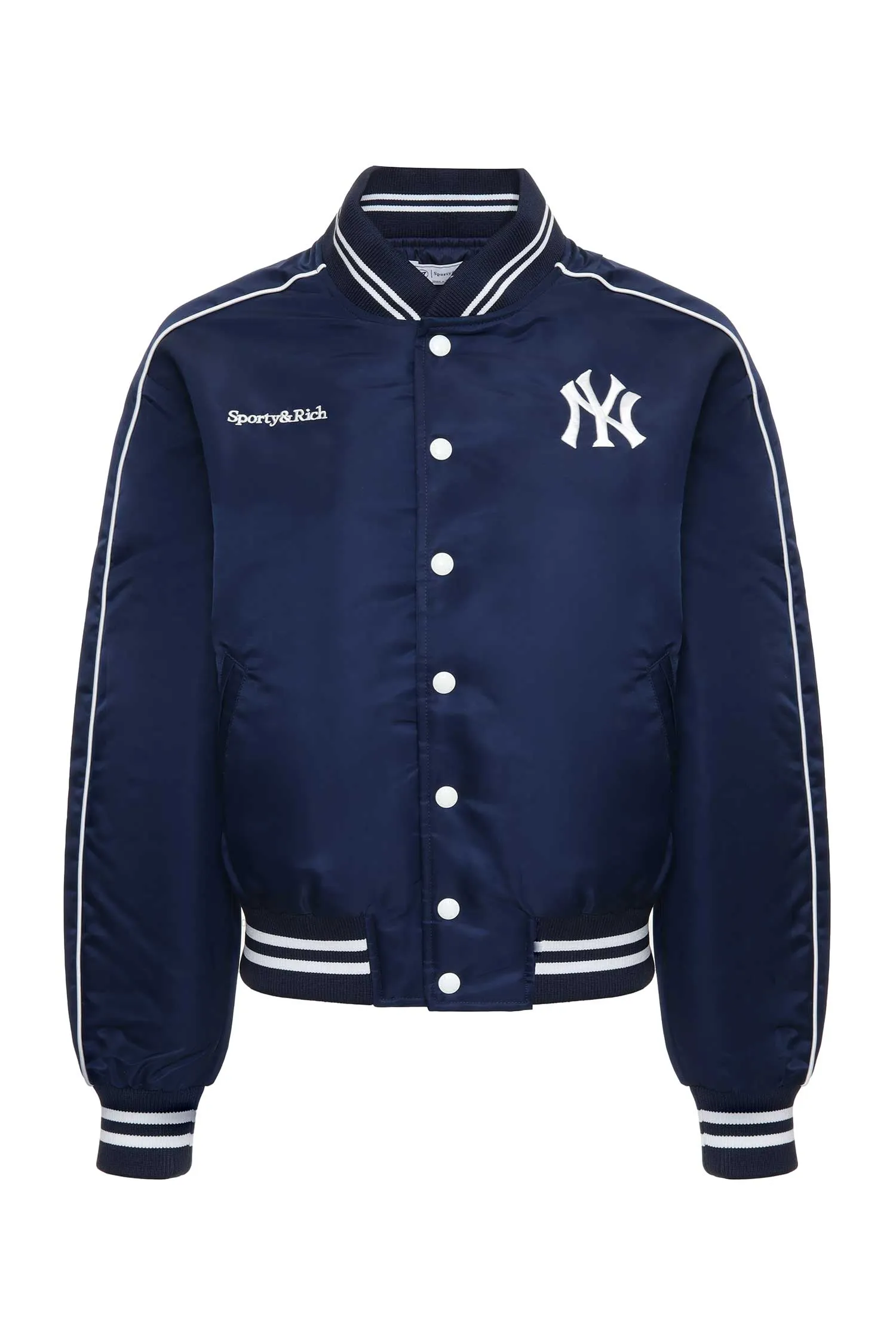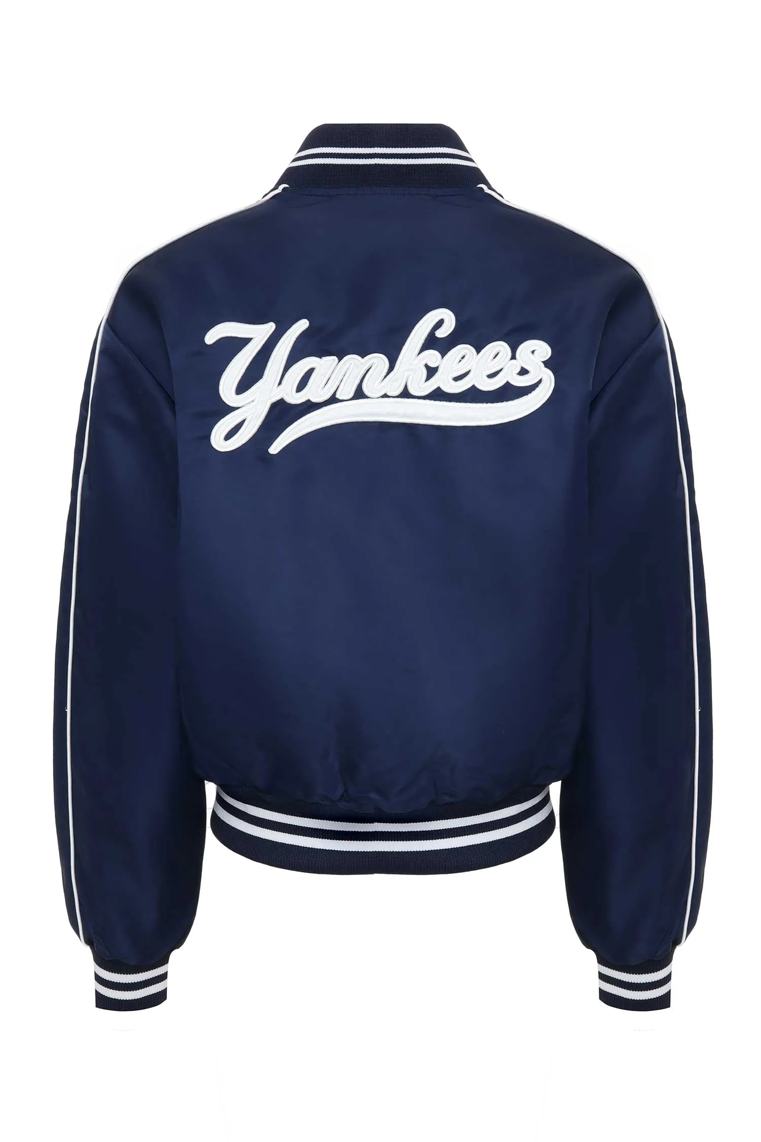 БОМБЕР Т/СИНИЙ ИЗ НЕЙЛОНА, УКОРОЧЕННЫЙ, БЕЛЫЕ ПОЛОСЫ НА ВОРОТНИКЕ И МАНЖЕТАХ, НА СПИНЕ НАШИВКА YANKEES