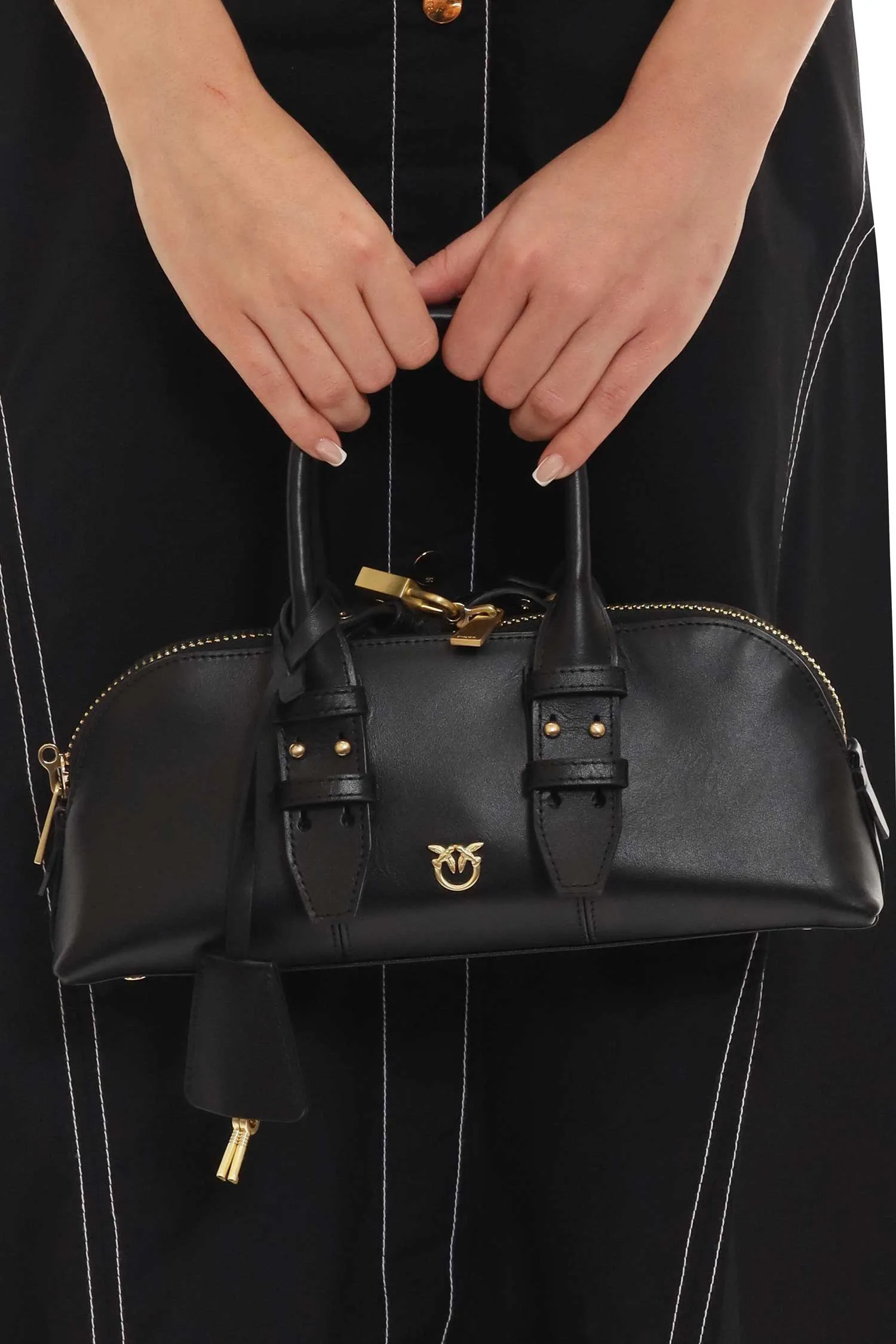СУМКА BOWLING SMALL ЧЁРНАЯ, МАТОВАЯ КОЖА, НА МОЛНИИ, ЗОЛОТИСТОЕ ЛОГО, БРЕЛОК-ЗАМОК, ОТСТЁГИВ.РУЧКИ, РЕМЕШОК