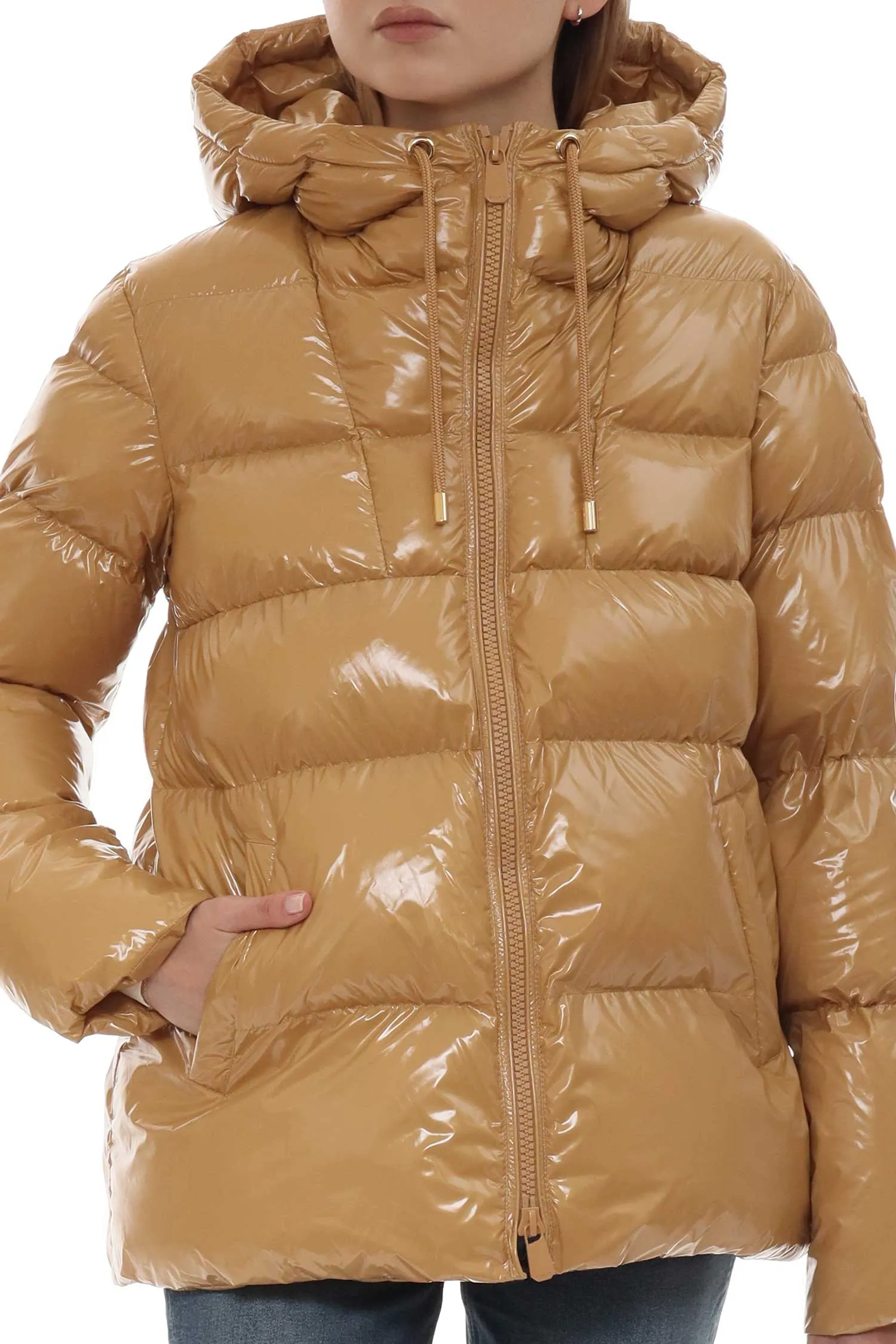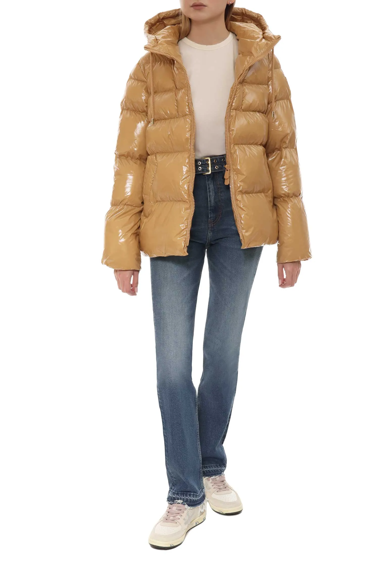 PINKO ПУХОВИК M.101 БЕЖЕВЫЙ ЛАК С СИНТЕТ.НАПОЛН., СТЁГАНЫЙ, КОРОТКИЙ, НА РУКАВЕ НАШИВКА-ЛОГО В ТОН, КАПЮШОН НА КУЛИСКЕ