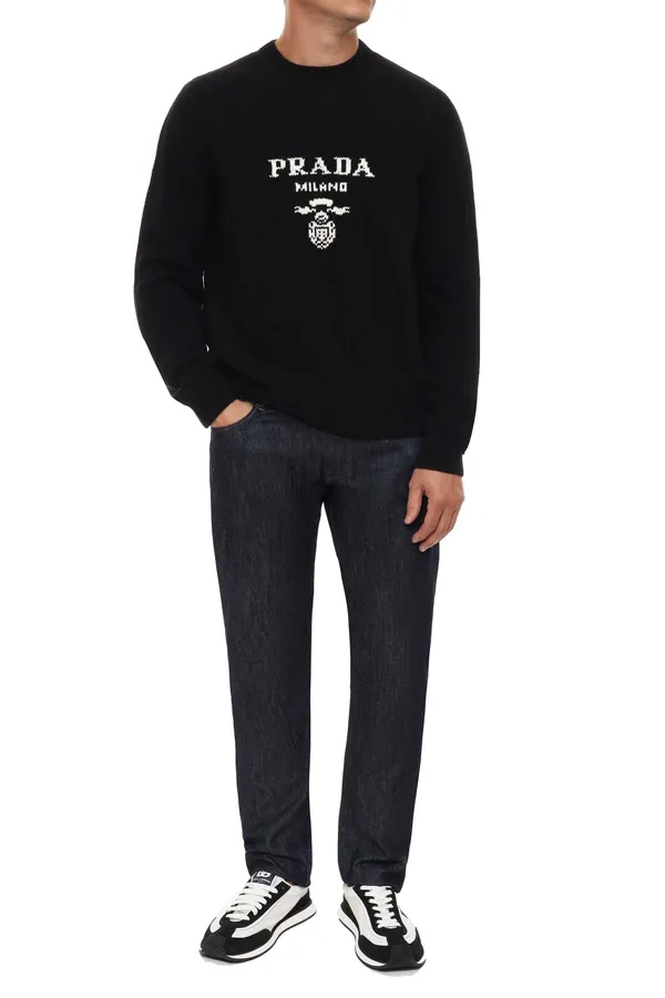 Джемпер Prada выполнен из мягкой шерсти с добавлением кашемира, что делает его особенно комфортным и тёплым. Классический силуэт с круглым вырезом и аккуратной резинкой по горловине, манжетам и низу подчеркивает универсальность модели. Лаконичный дизайн дополнен вышитым логотипом на груди — узнаваемым акцентом в стиле бренда. Идеальный выбор для повседневного образа с ноткой элегантности.